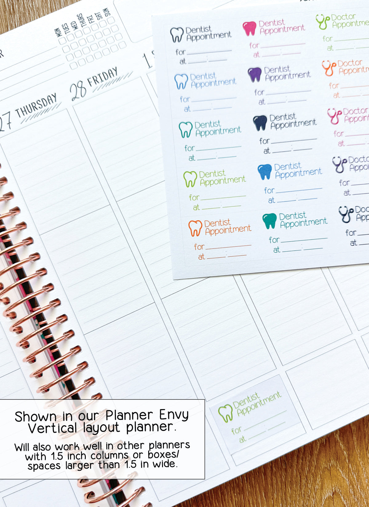 ✦ Each sticker is 1.5 inches wide by 1 inch in length. These stickers are perfectly sized to fit within the width the boxes (weekly spreads) of: