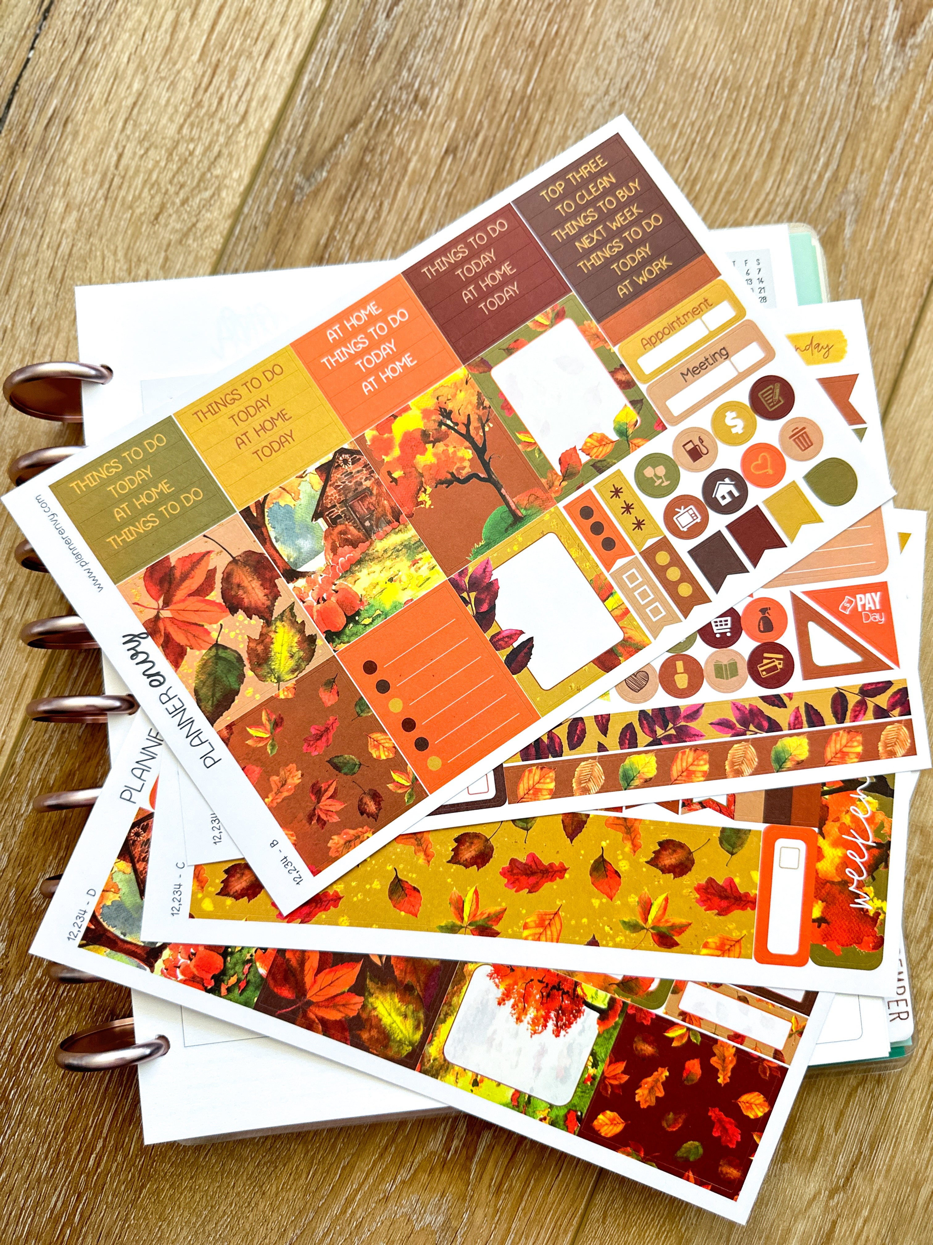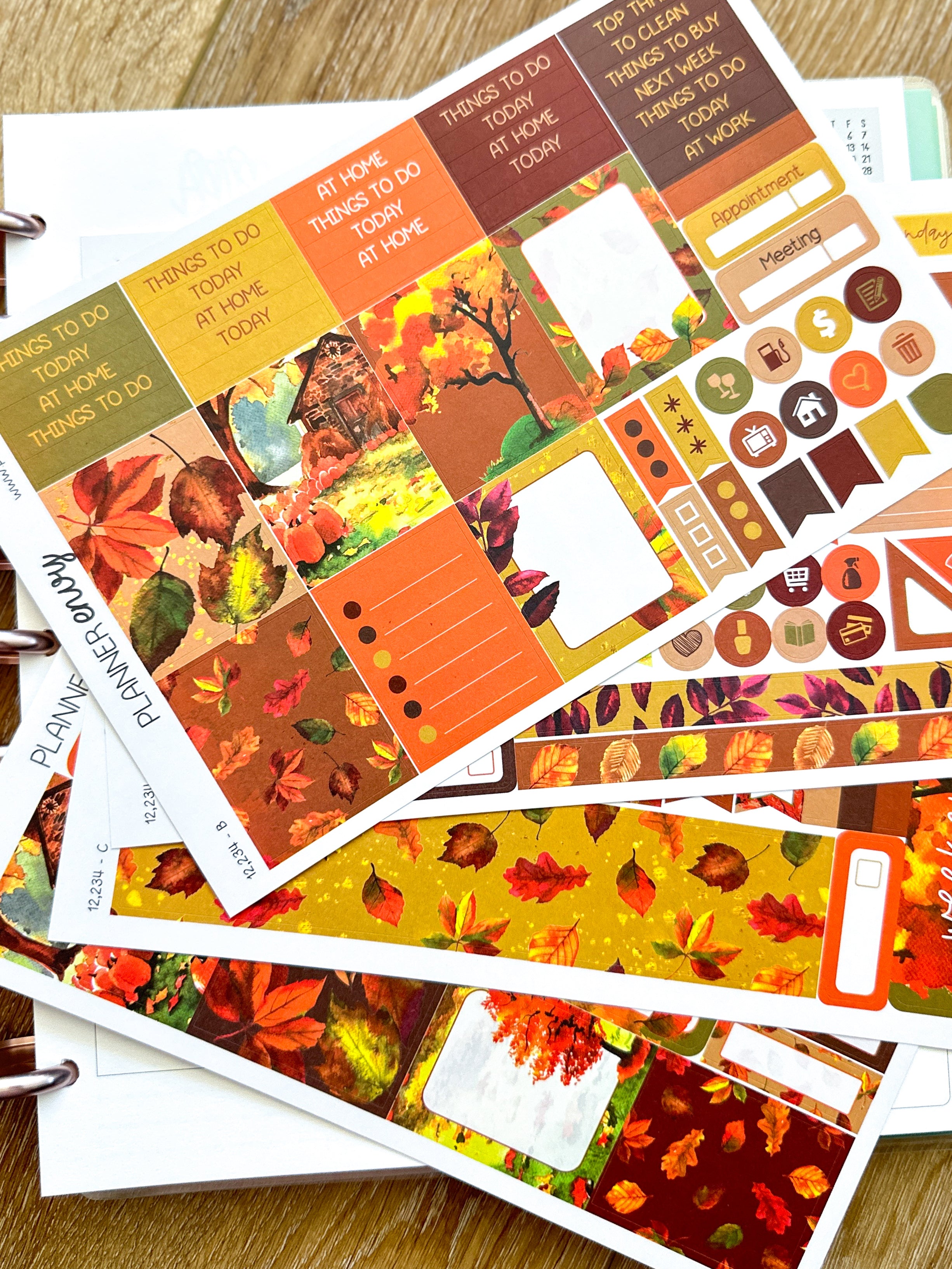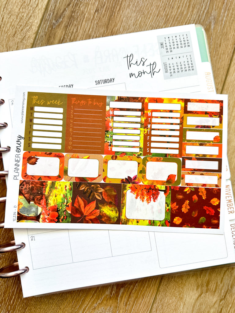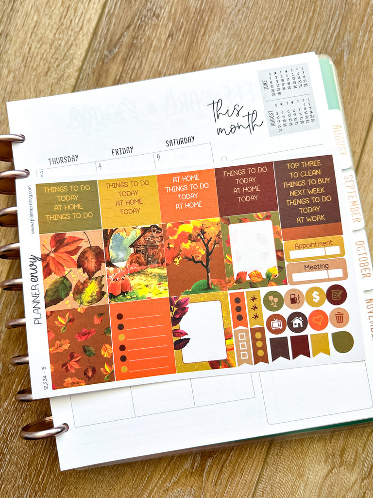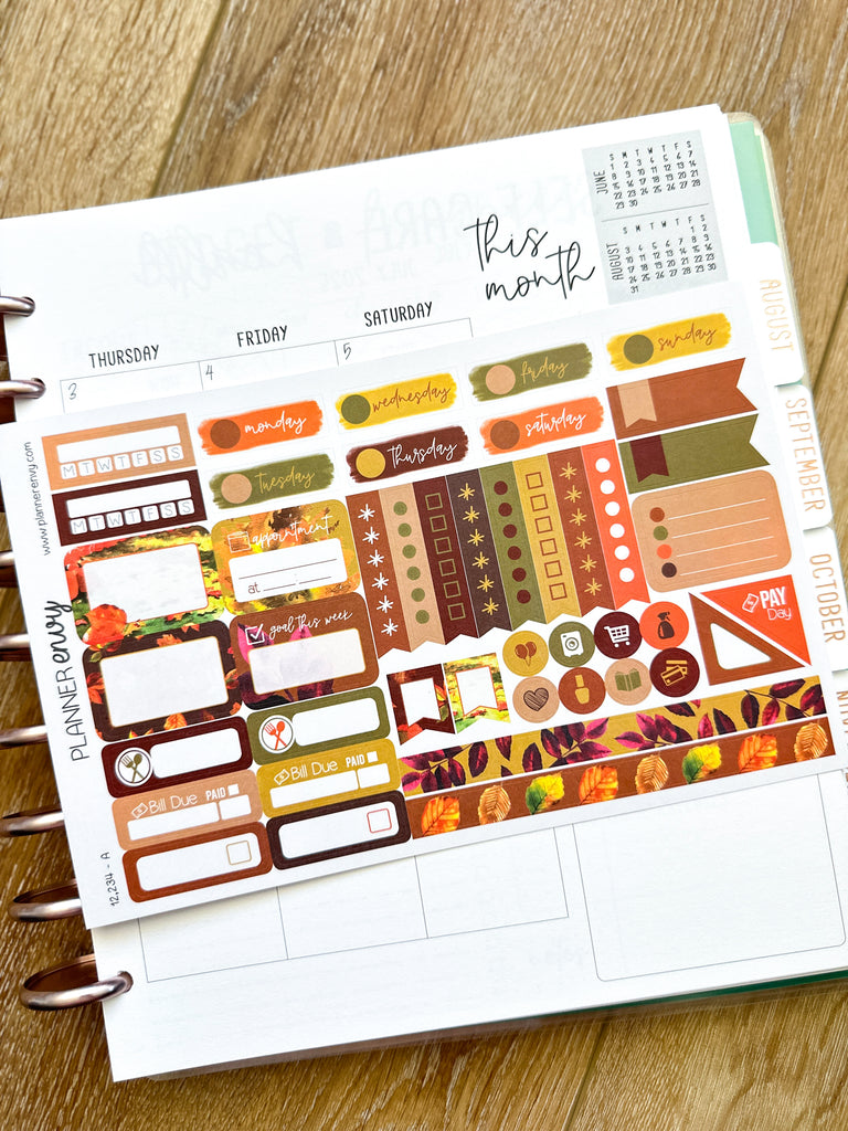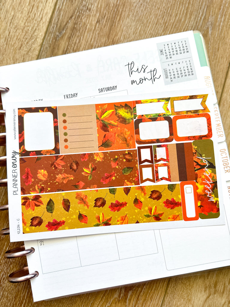Autumn Leaves Fall Foliage Orange & Brown Planner Stickers 4-Page Weekly Kit - 133 Stickers (#12,234)