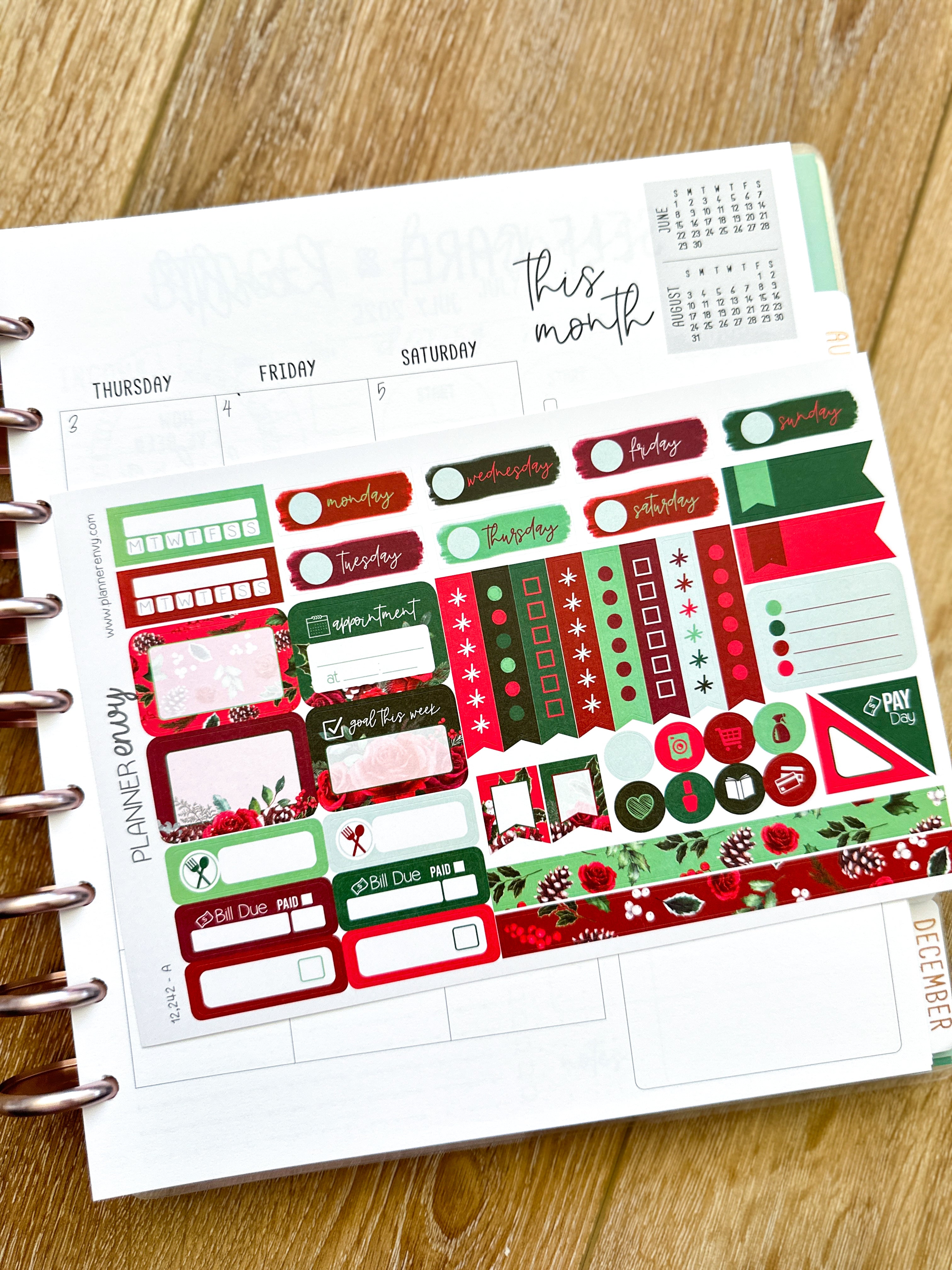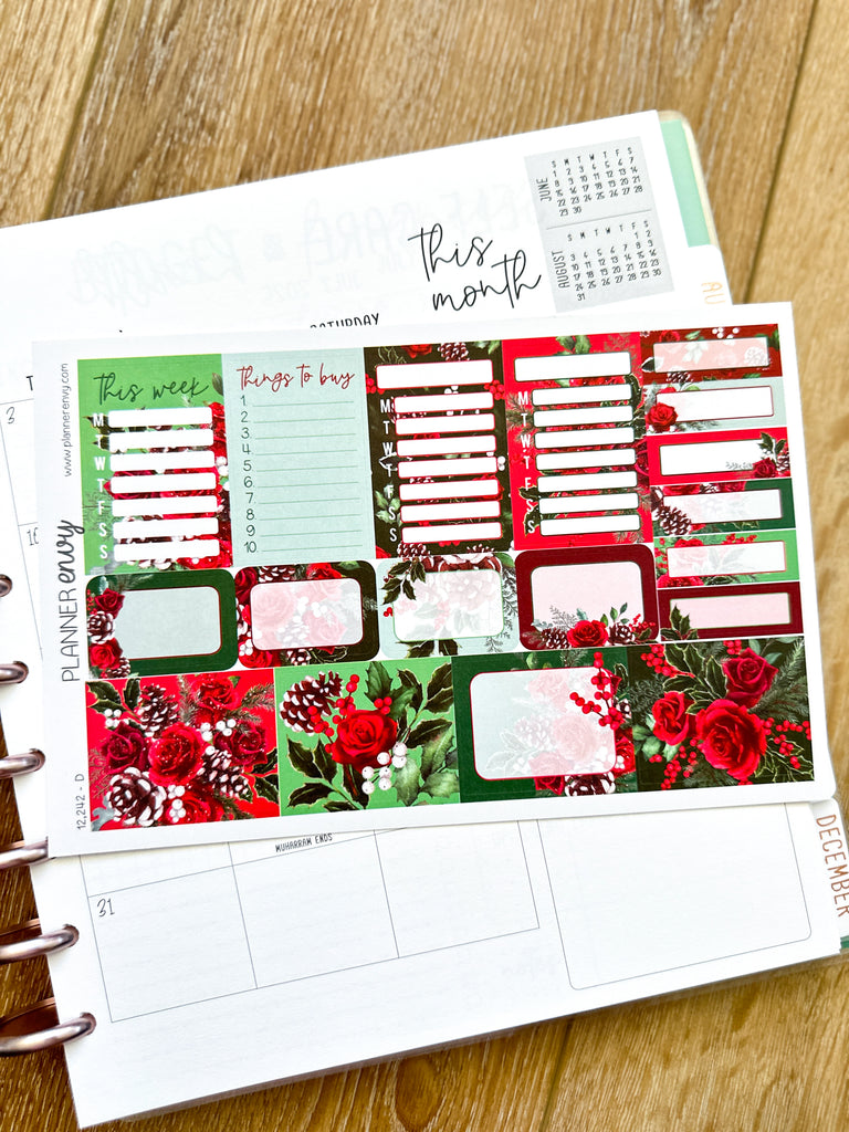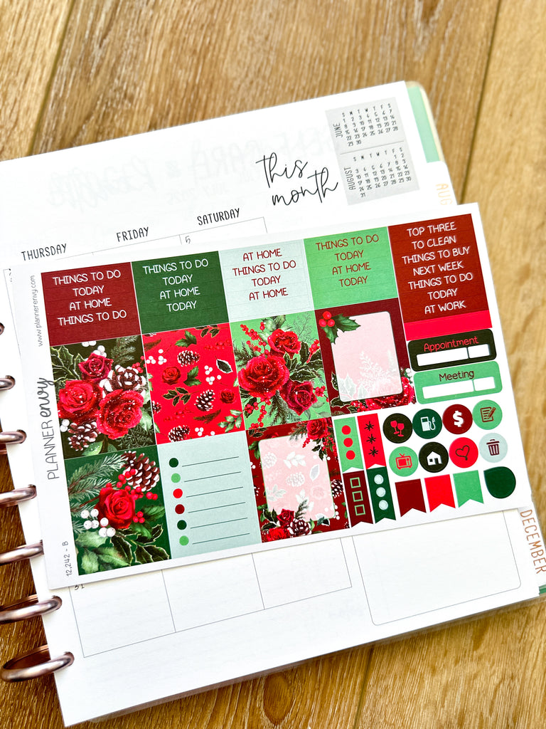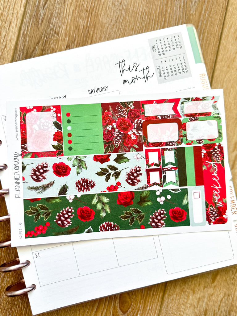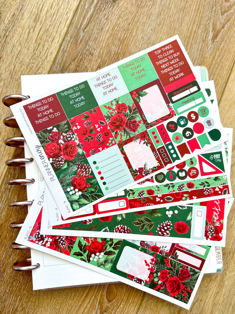 Christmas Holiday Florals Snow Covered Pine Cones Red & Green Planner Stickers 4-Page Weekly Kit - 133 Stickers (#12,242)