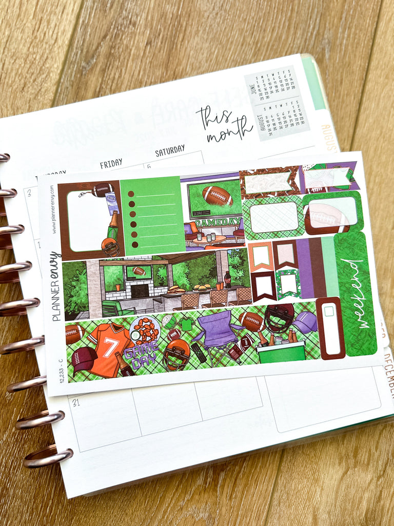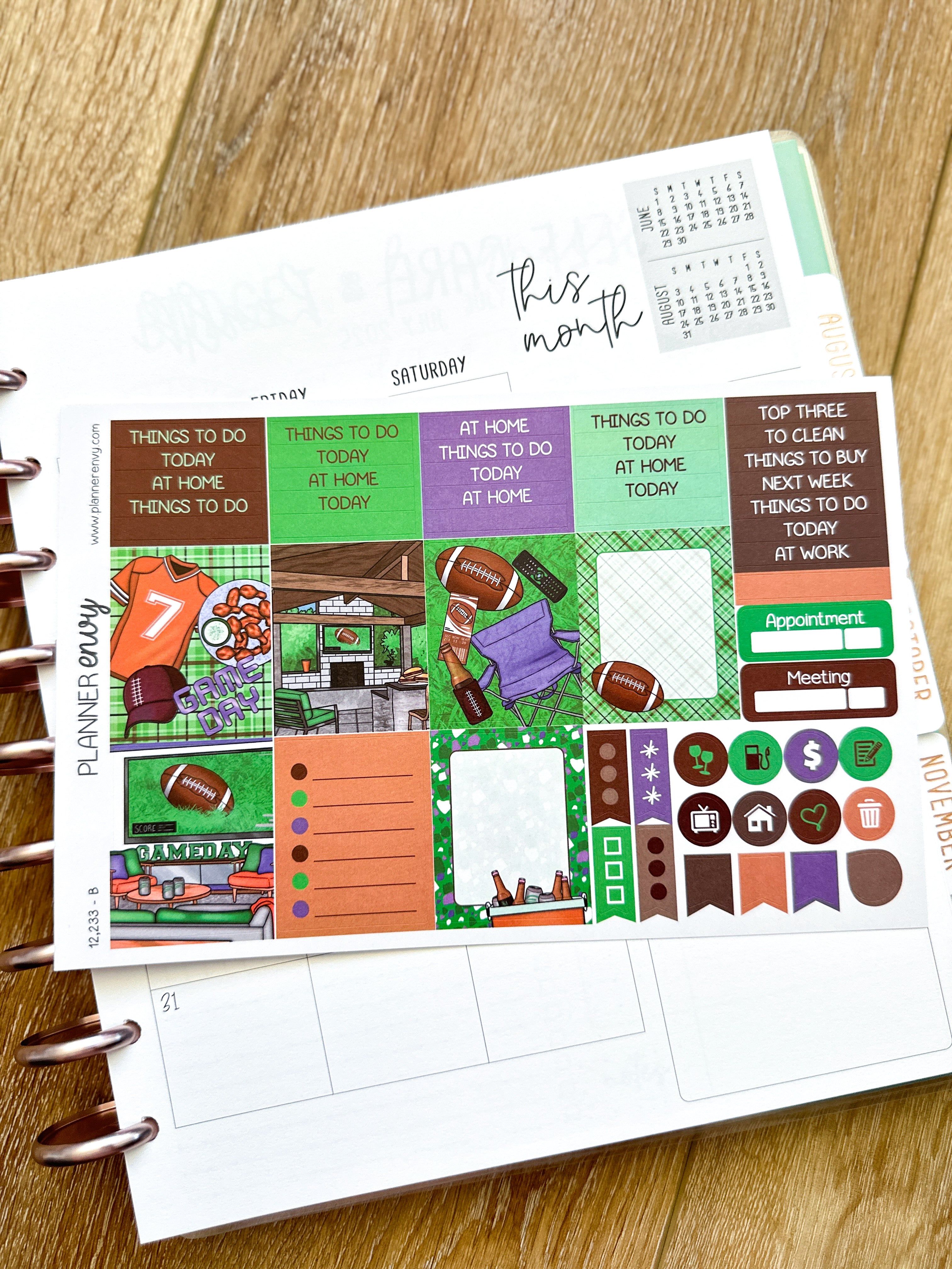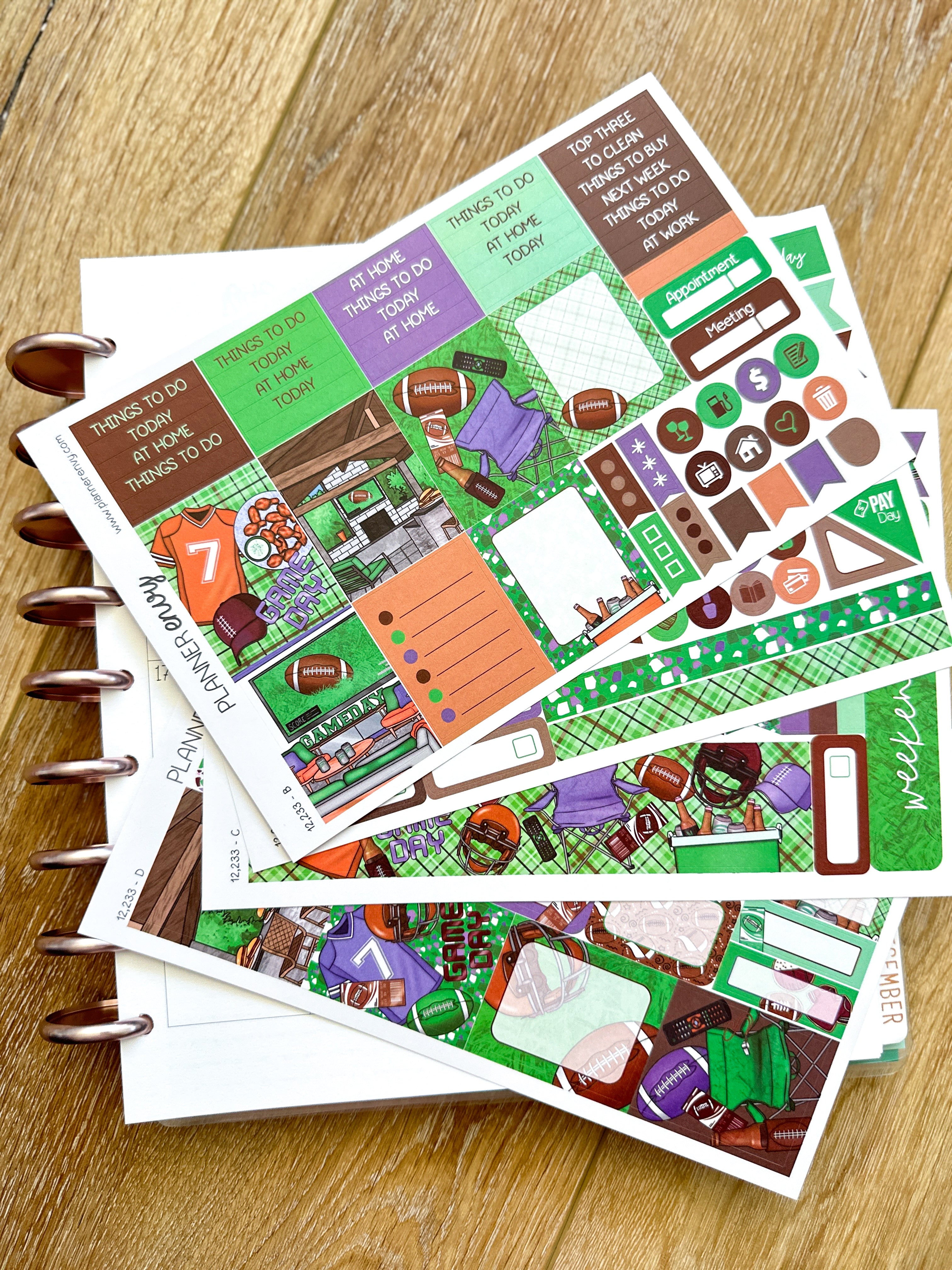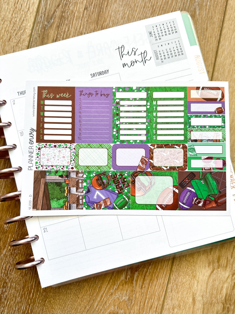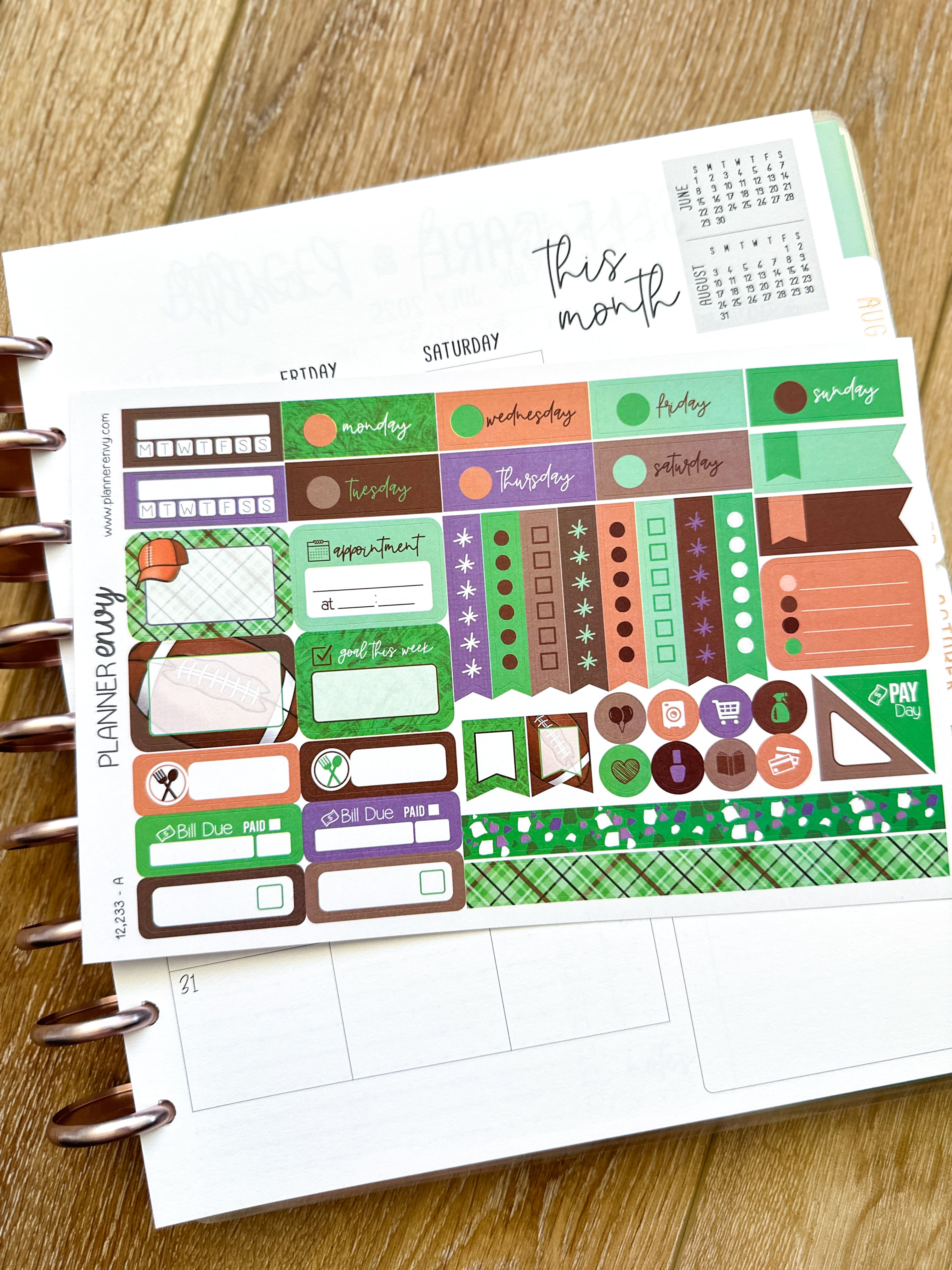 Football Game Night Green & Brown Fall Planner Stickers 4-Page Weekly Kit - 133 Stickers (#12,233)