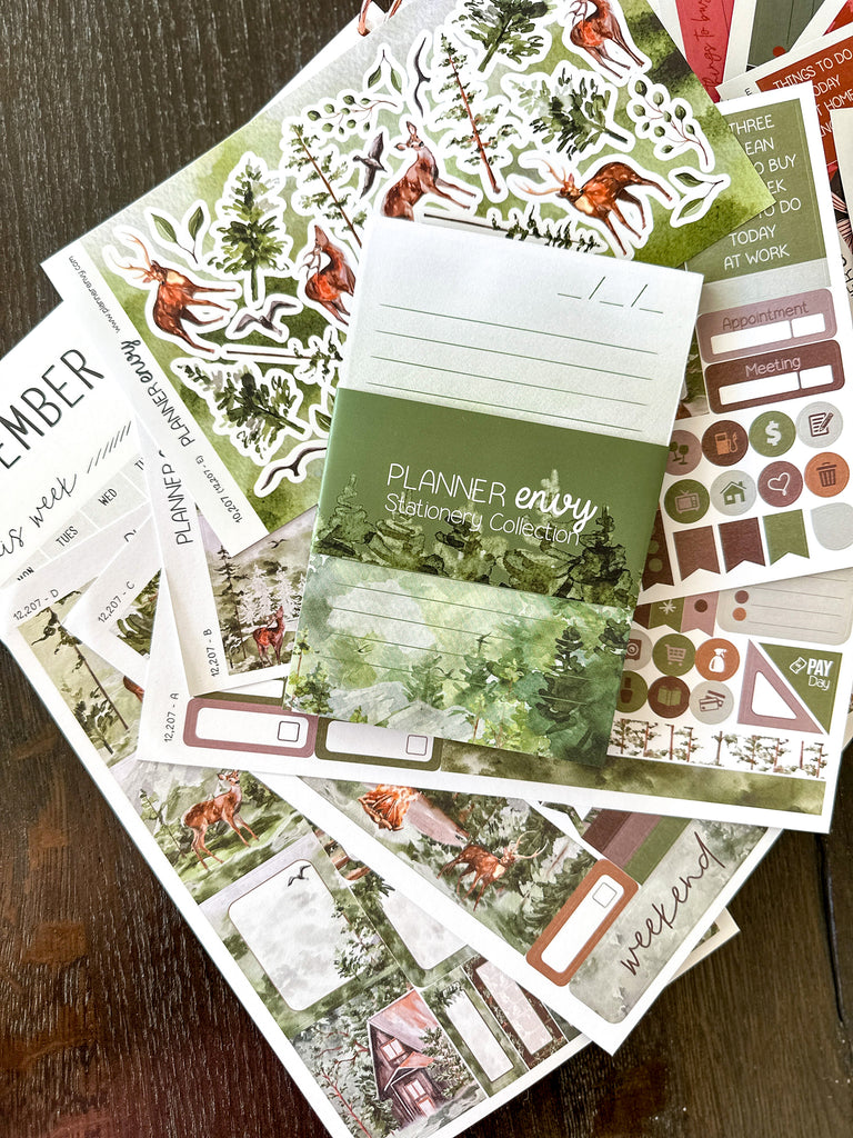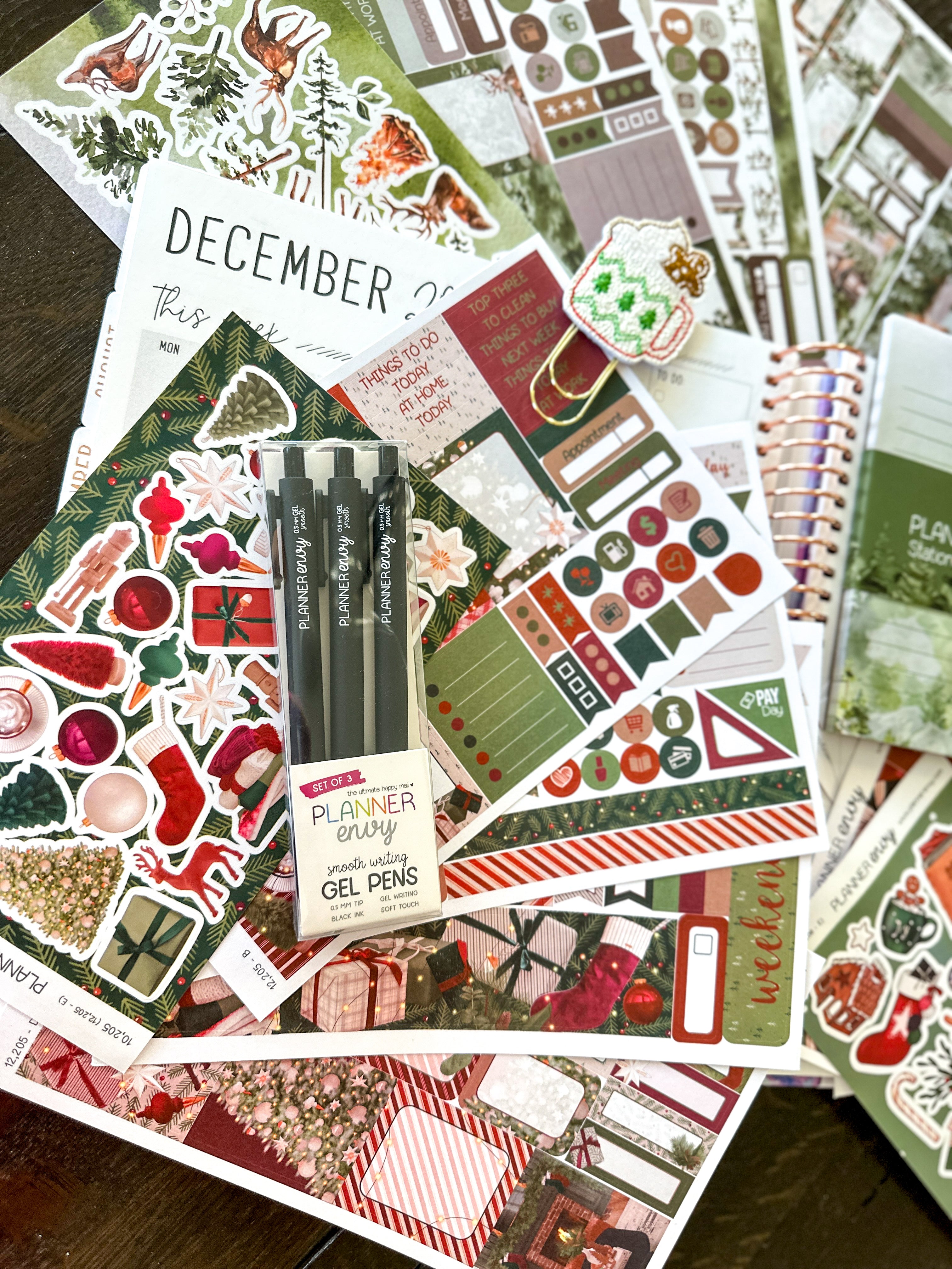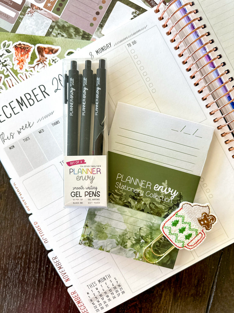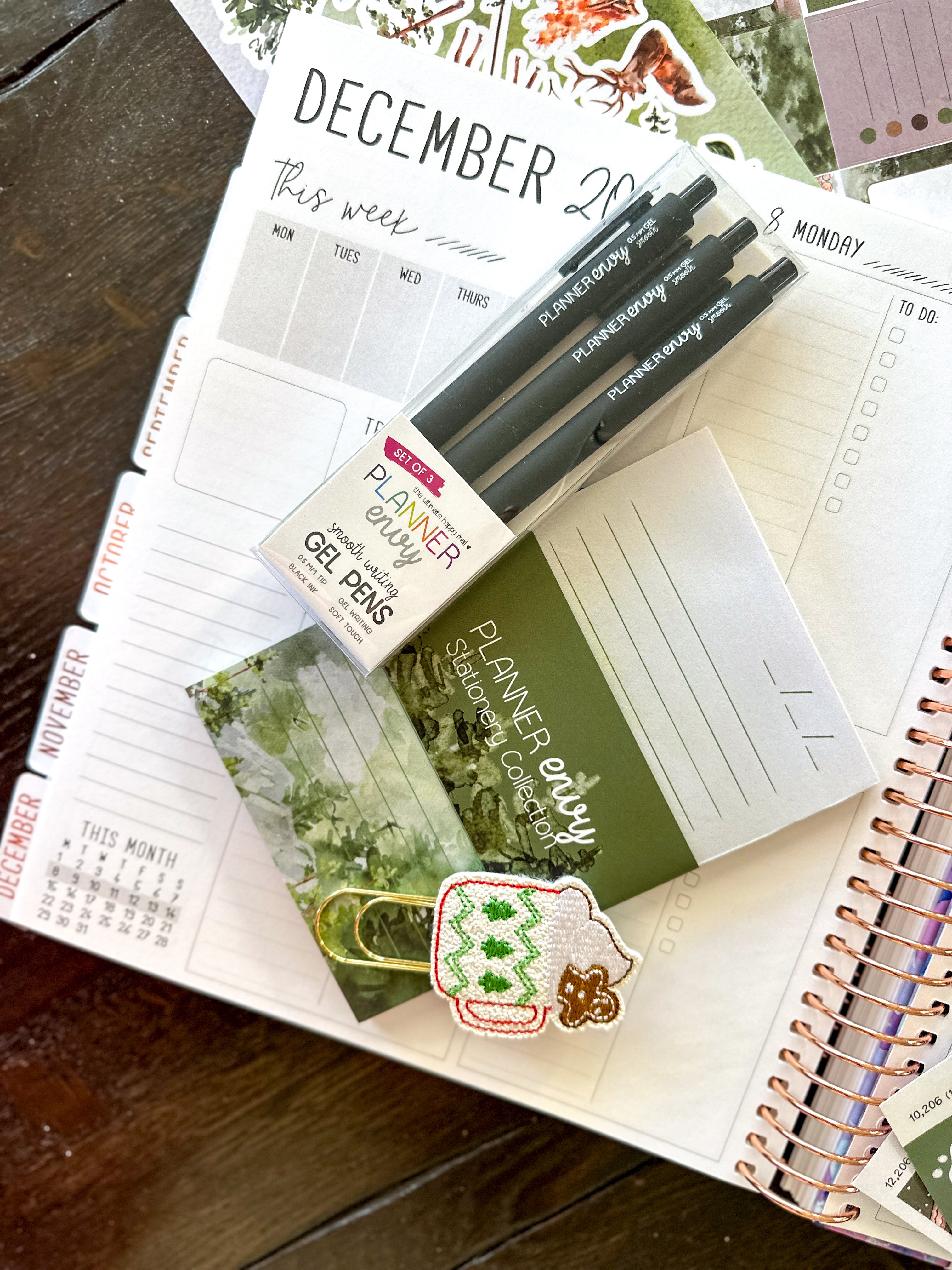 • Planner accessories shown: set of 3 gel pens, big feltie clip, and matching notepad
