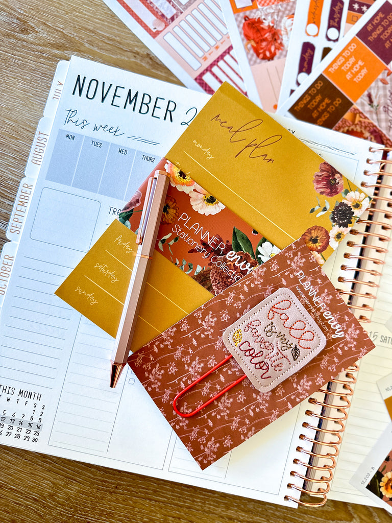 • Planner accessories shown: pen, big feltie clip, and matching notepad
