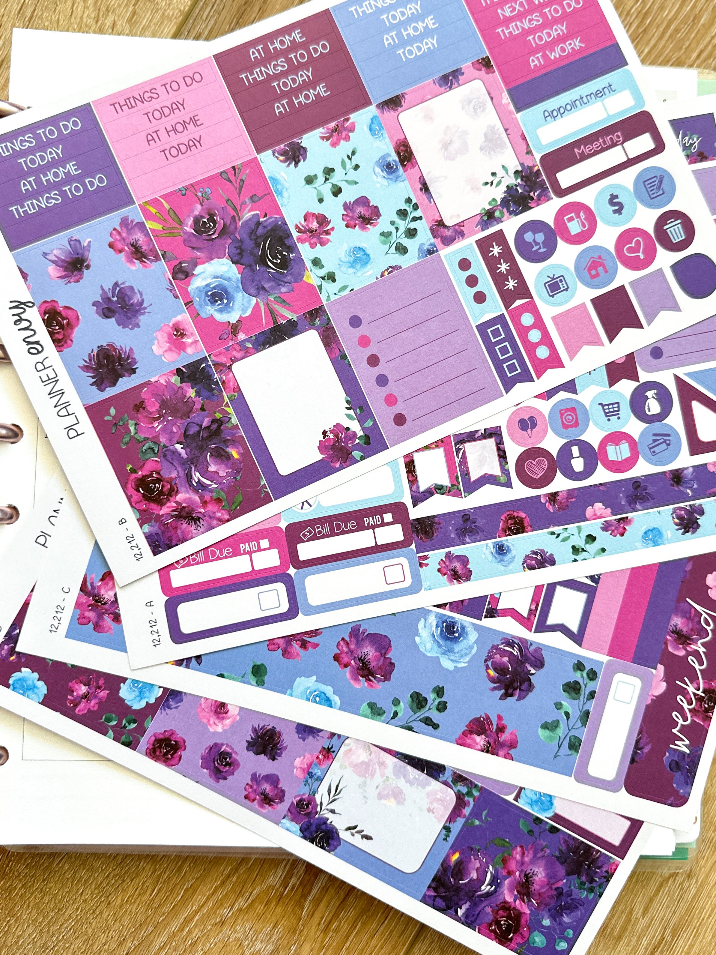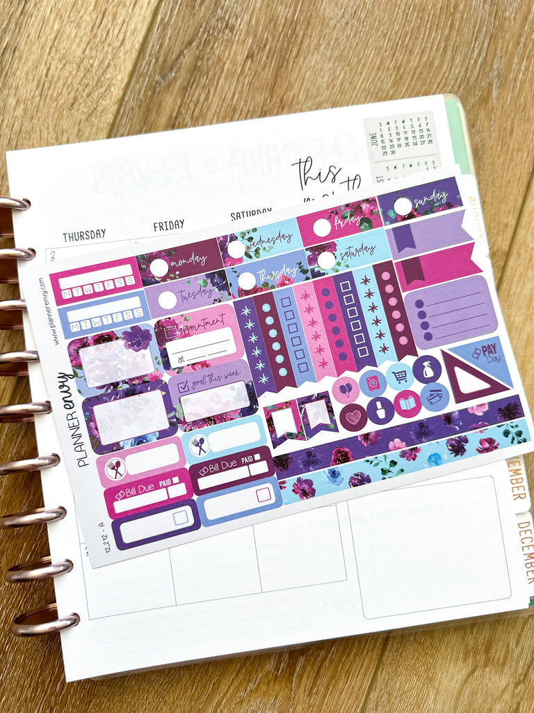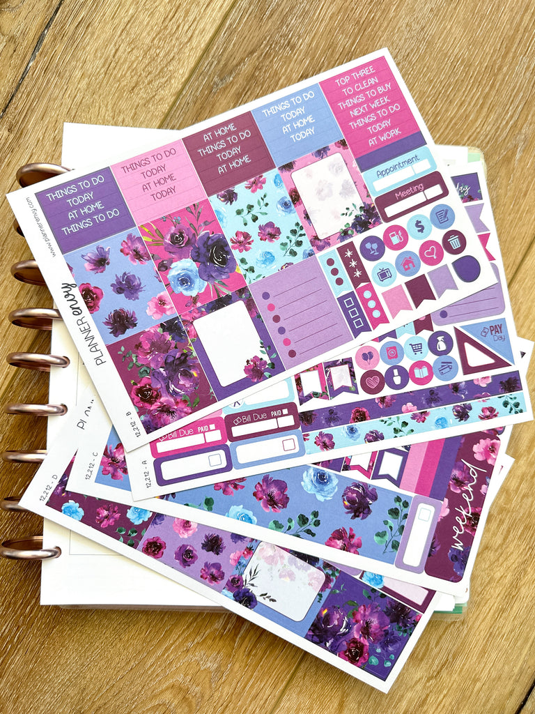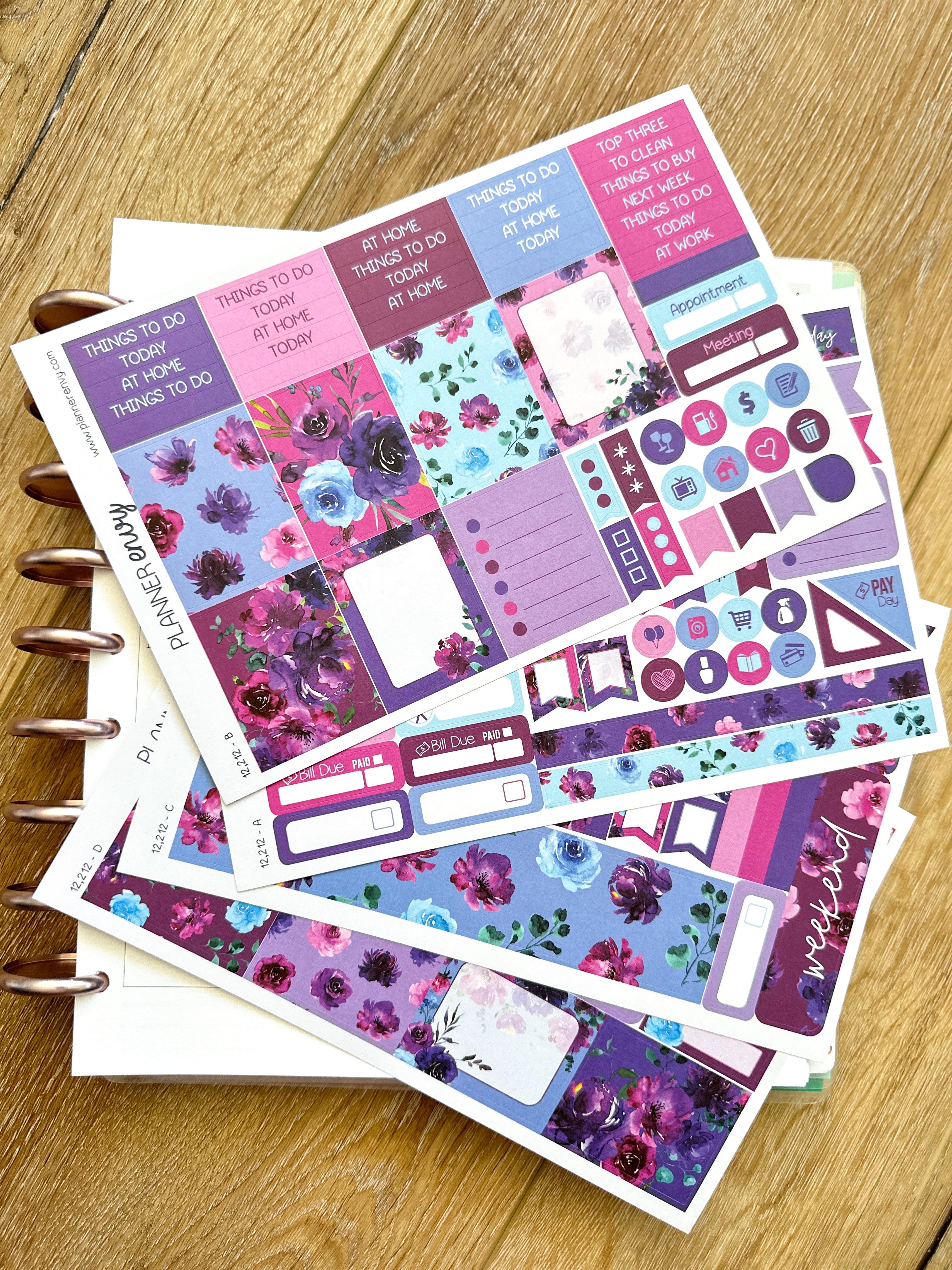 Floral Purple Pink & Blue Flowers Planner Stickers 4-Page Weekly Kit - 133 Stickers (#12,212)