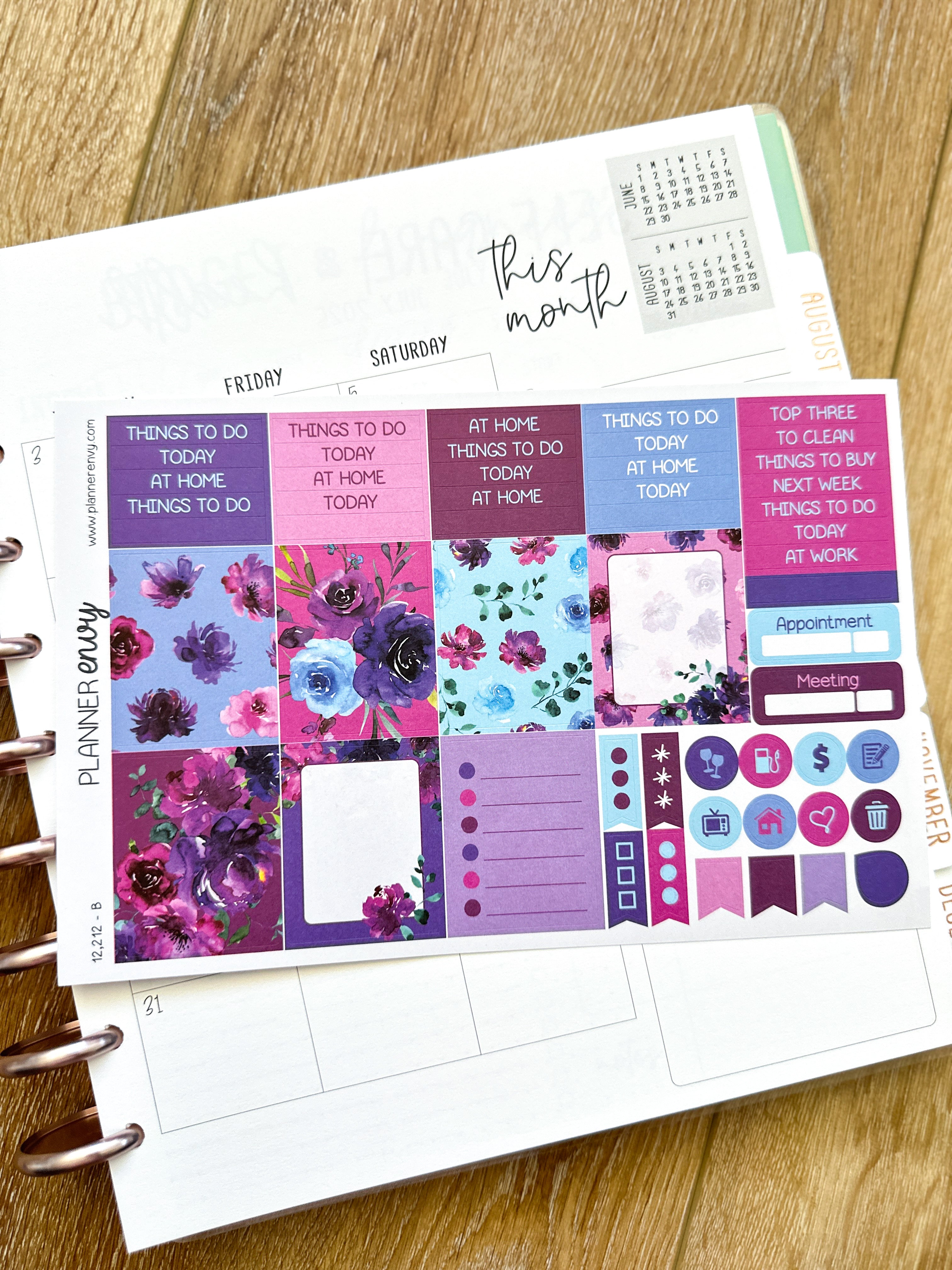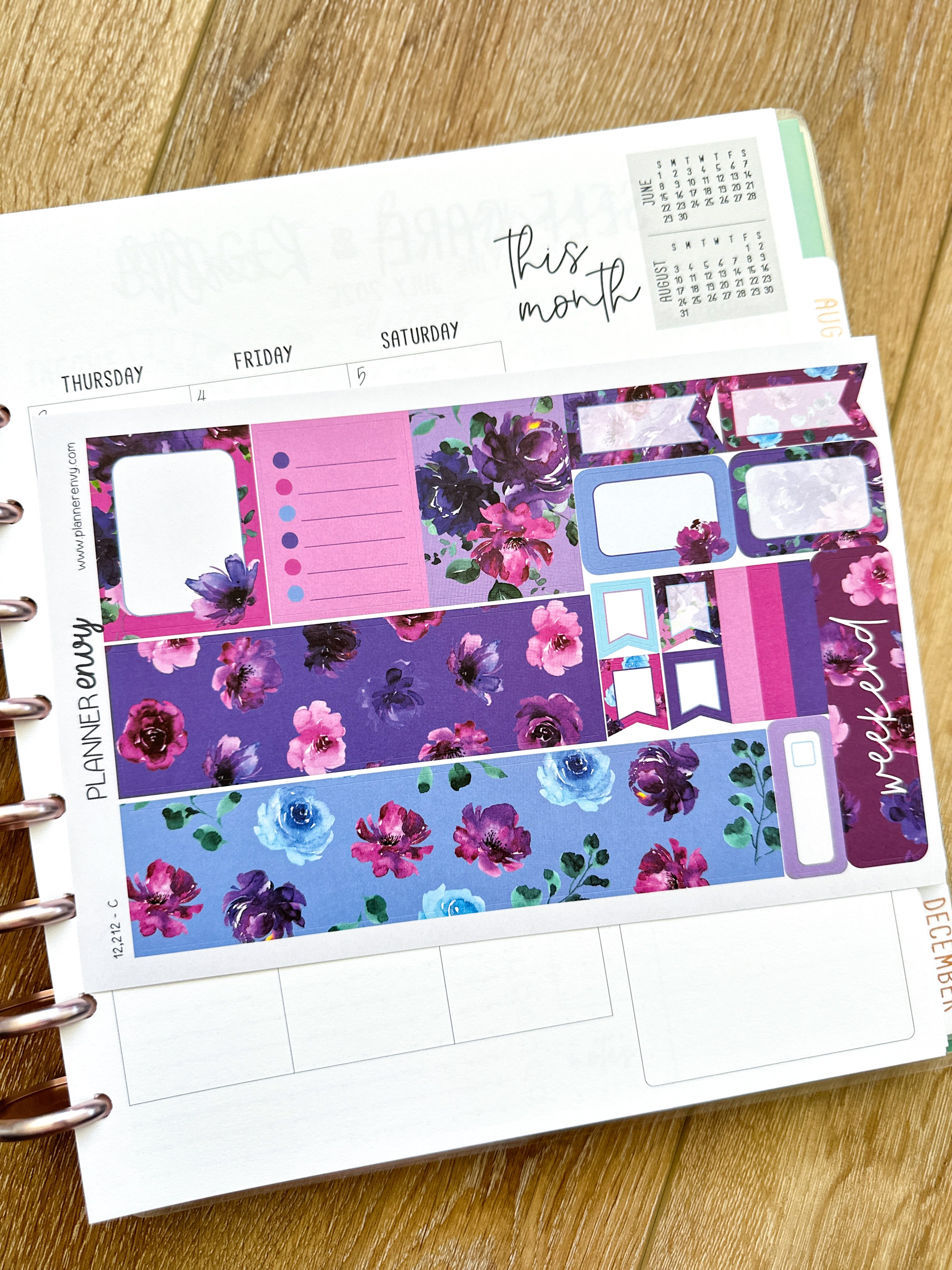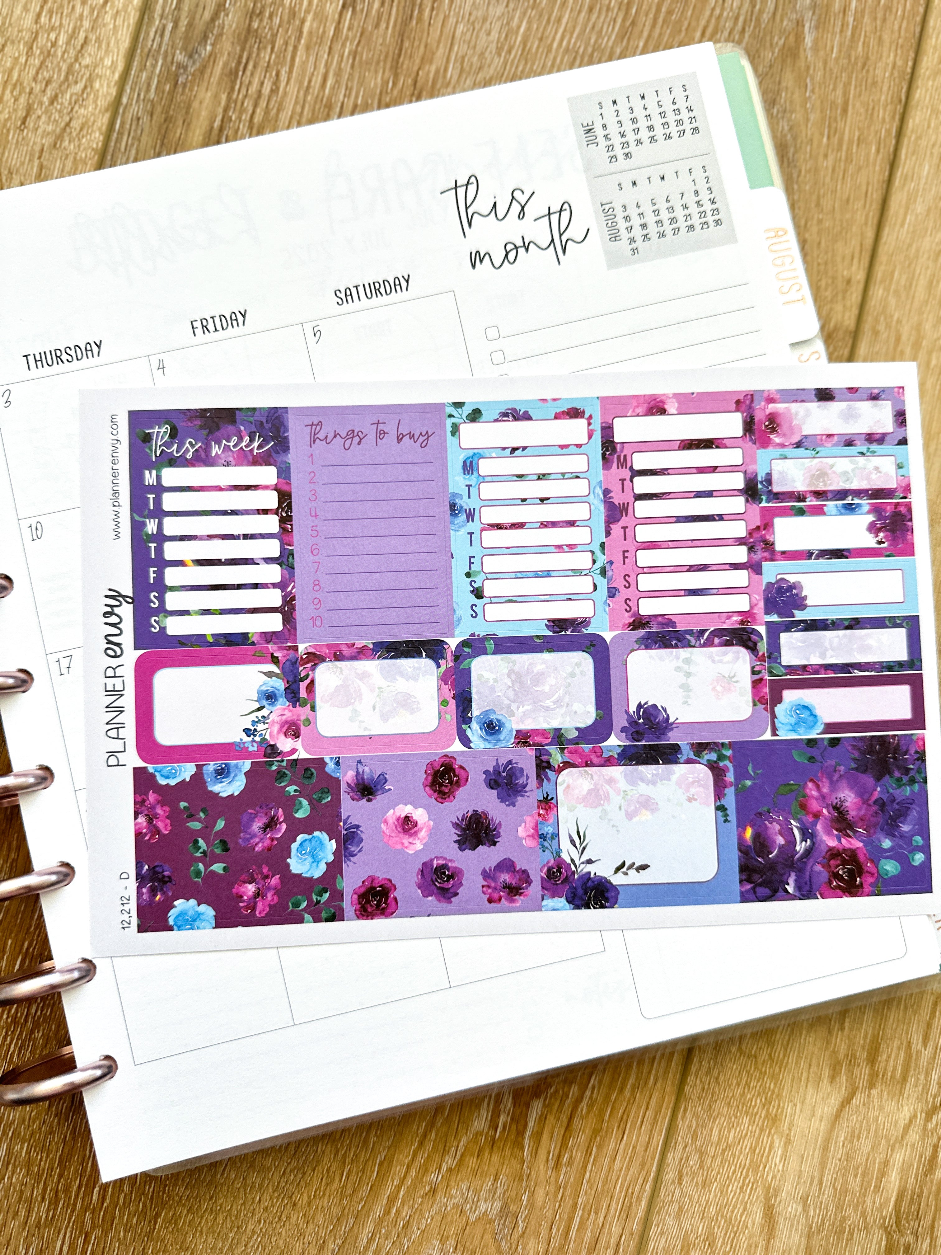 Floral Purple Pink & Blue Flowers Planner Stickers 4-Page Weekly Kit - 133 Stickers (#12,212)
