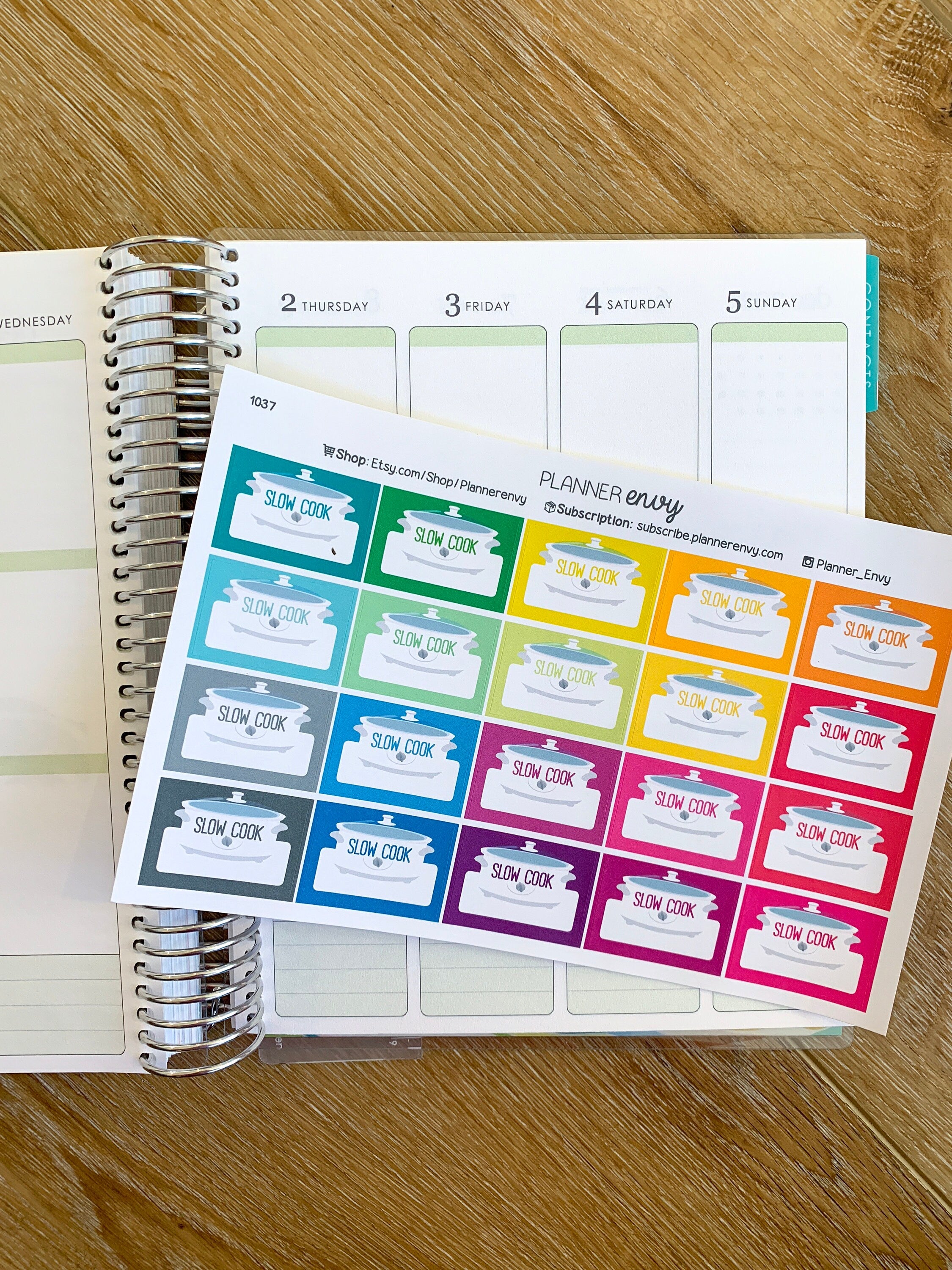 Slow Cooker Croc Pot Kitchen Cooking Planner Stickers to be used with Erin Condren ECLP, Happy Planner, Recollections (#1037) ✦ Each sticker is 1.5 inches wide by 1 inch in length. These stickers are perfectly sized to fit in the boxes of: ▶The Original Size Erin Condren Vertical Life Planner ▶The Medium Size Happy Planner ▶The Medium Size Vertical Recollections Planner ✦ Sticker sheet is 5.5inches wide by 8.5 inches long. ✦ 20 stickers per sheet. ✦ Professionally printed on matte sticker paper. Once these are positioned, they cannot always be moved. They do seem to pull up pretty easily and can be re-stuck to the pages of the ECLP & Happy Planner, but do not pull up cleanly from Recollections or from on top of other stickers. ✦ Bright, vibrant, and ready to make your planner stand out! ✦ These do not have any finish and should be easy to write on with most pens - ballpoint pens and fine tip sharpies seem to look the best! ✦ Save on shipping when you buy multiple sheets! ▶ ▶ ▶ To view more Planner Envy brand stickers, click here to view my shop: https://www.etsy.com/shop/PlannerEnvy ▶ ▶ ▶ DEALS & DISCOUNTS ◀◀◀ ✦ Spend $15 or more, get 10% off >> "SAVE10ON15" ✦ Spend $20 or more, get 15% off >> "SAVE15ON20" ✦ Spend $35 or more, get 20% off >> "SAVE20ON35" **ONE COUPON CODE PER TRANSACTION** ▶ ▶ ▶ CURRENT SHIPPING TIME ◀◀◀ Planner stickers will usually be shipped within 3-5 business days depending on current orders! Please check my shop homepage and announcement to see my current shipping time and make sure I am not on vacation or out of town. ▶ ▶ ▶ USAGE & COPYRIGHT ◀◀◀ ALL ITEMS ARE FOR PERSONAL USE ONLY. © Planner Envy PRINTED PAGES, STICKERS AND OTHER PHYSICAL ITEMS All of my physical items are for person use only. No commercial use. They can be used for your personal planner or be gifted for personal use. They are not to be sold as is or manipulated, alone or as part of a group or package, on or off of Etsy.com. Not intended for resale of any kind. © 2015 Planner Envy