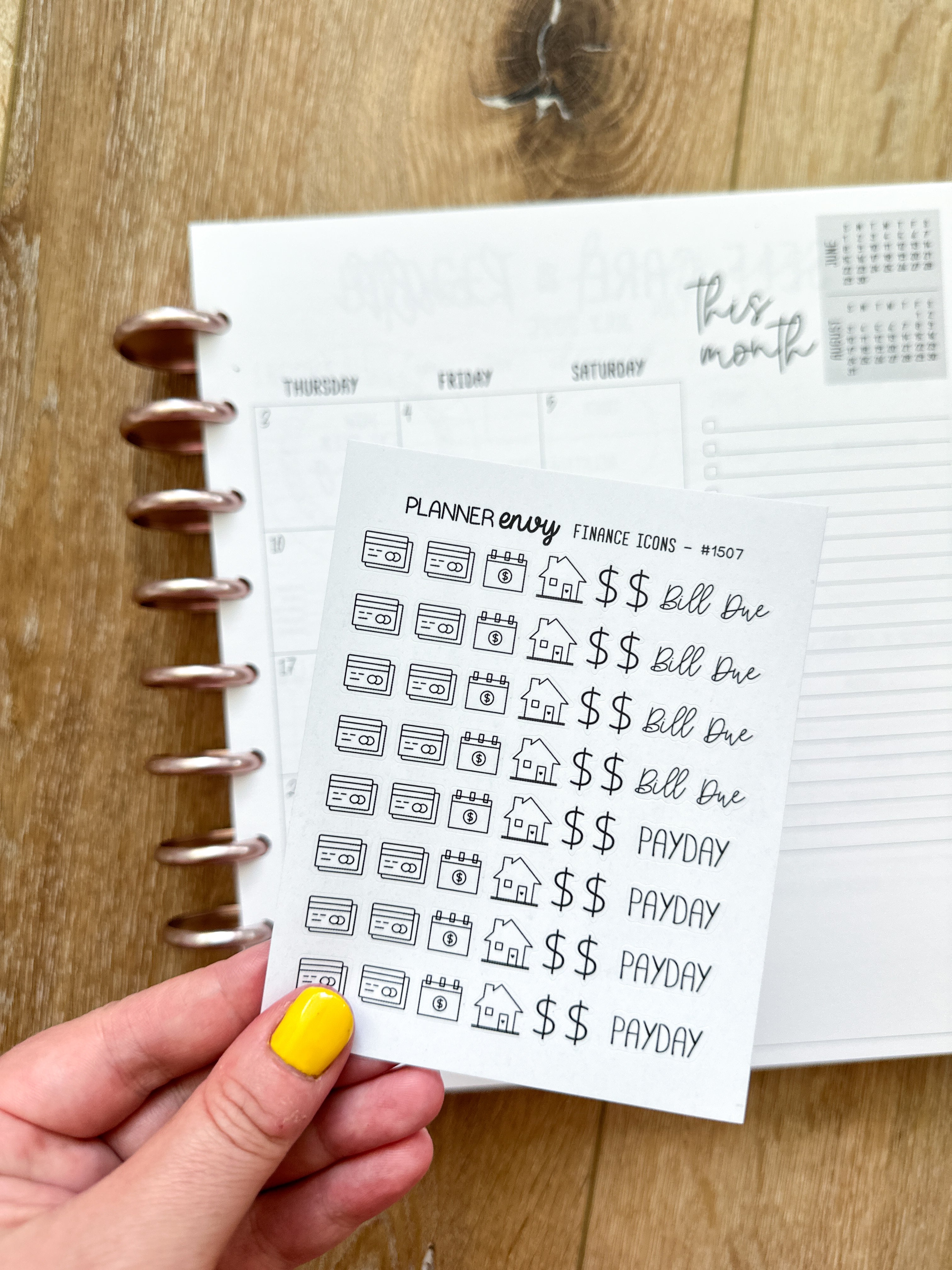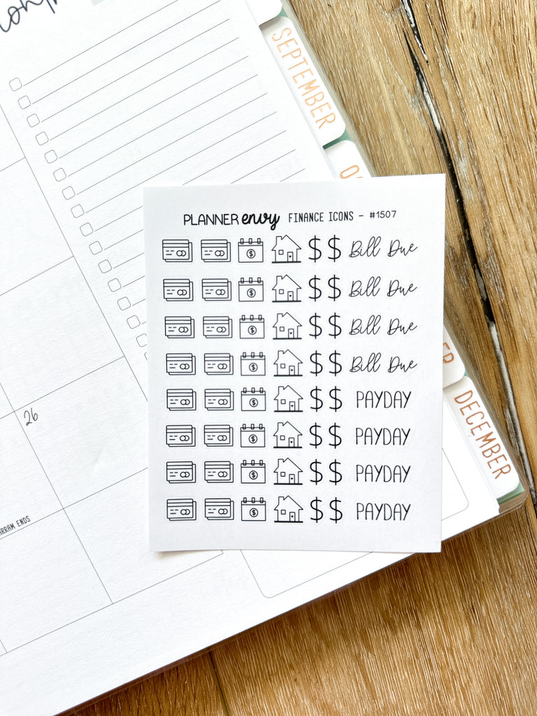 Money Icons - Bill Due Pay Day Credit Card House Mortgage - Minimalist Planner Stickers - 1 Mini Sheet (#1507)