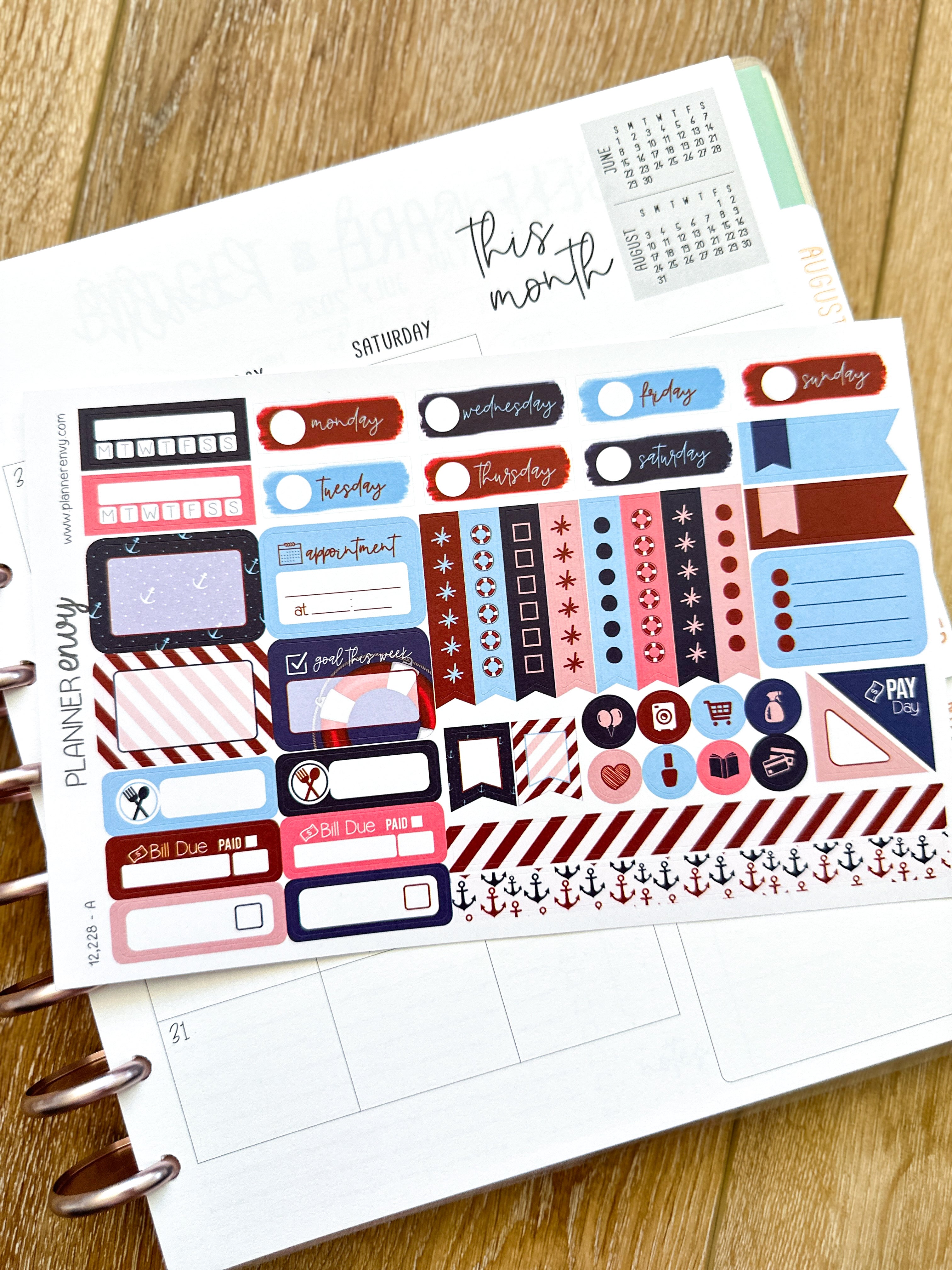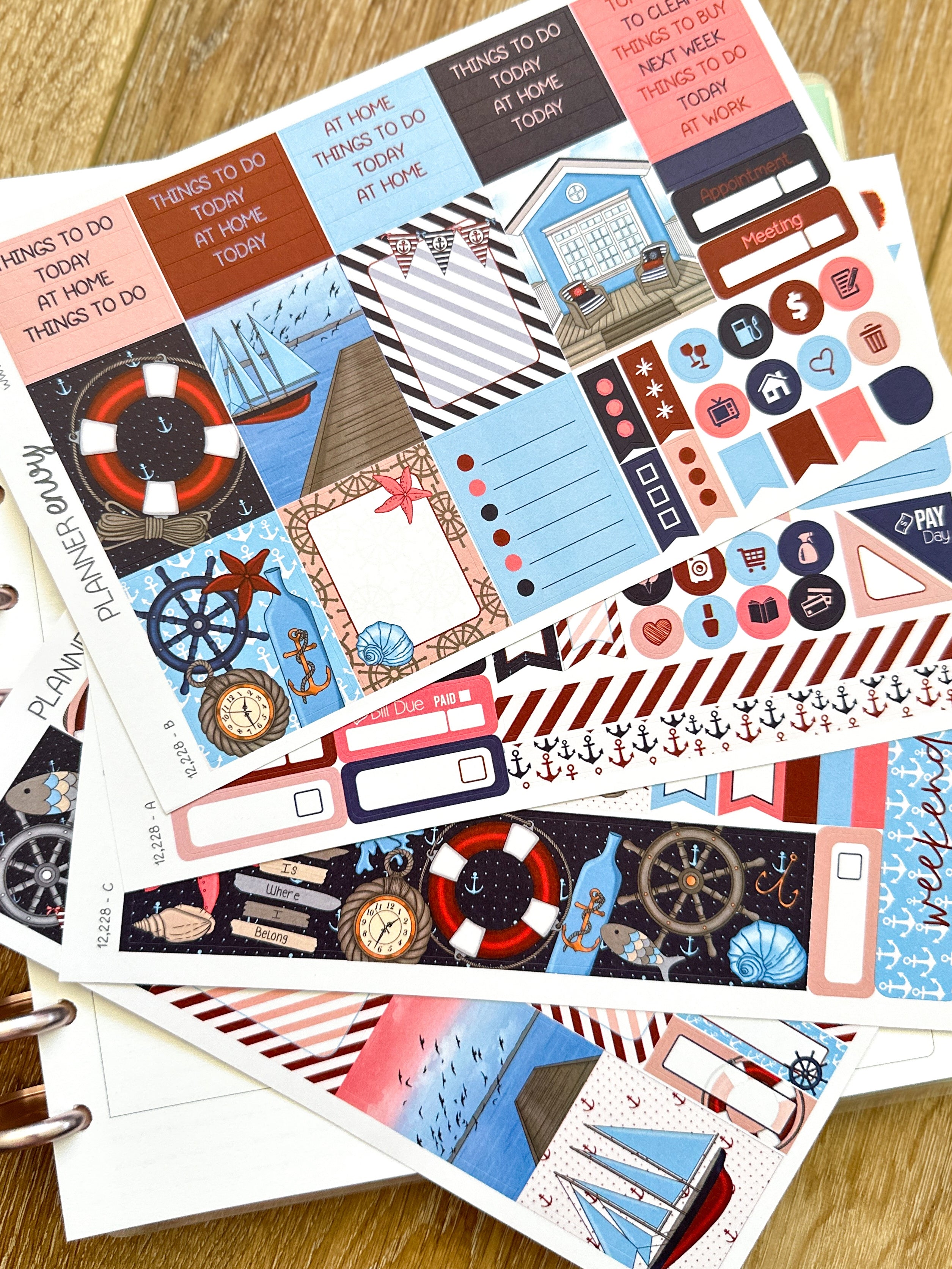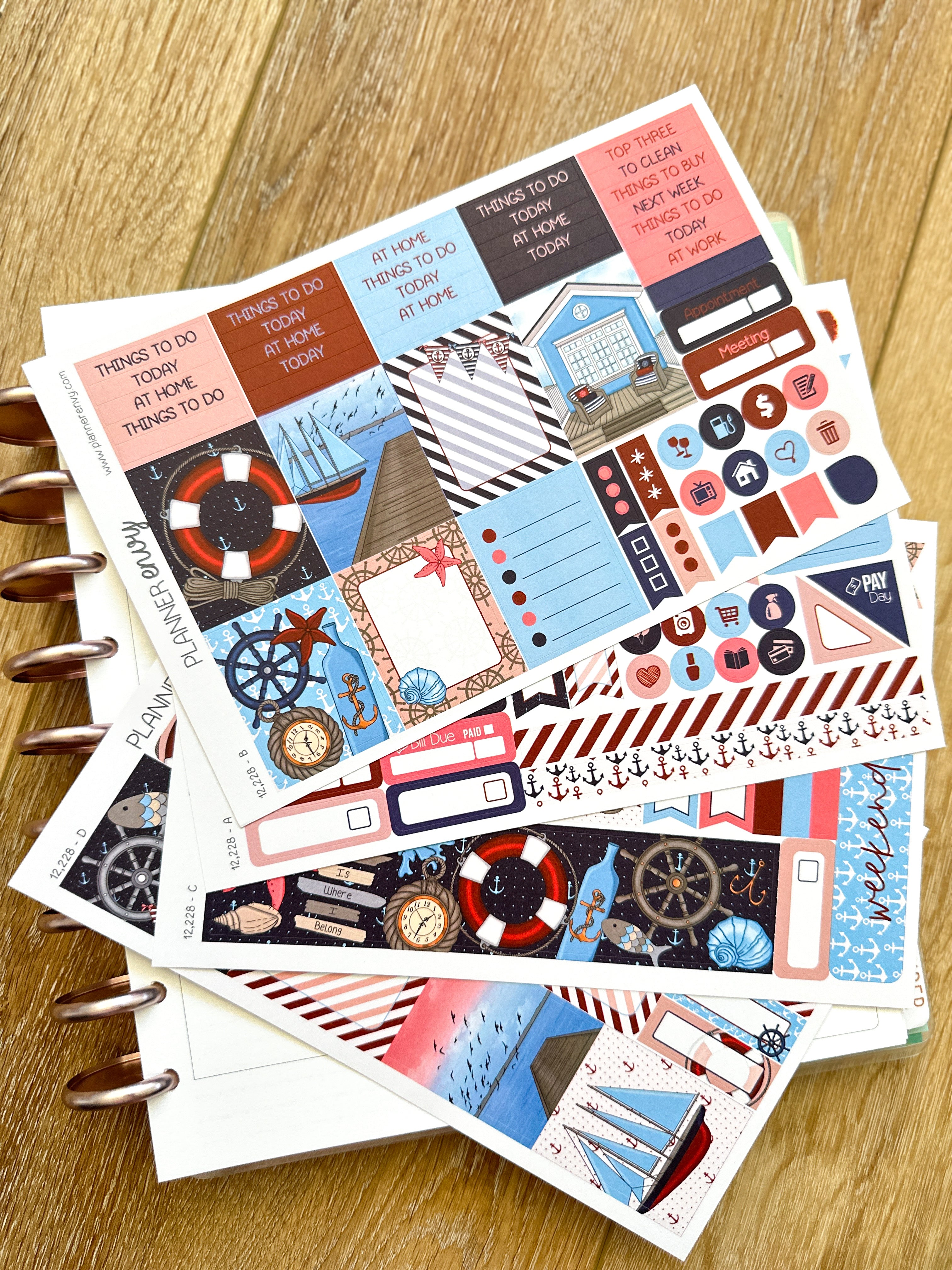 Nautical Beach Sailboats Red Blue Seashells Planner Stickers 4-Page Weekly Kit - 133 Stickers (#12,228)