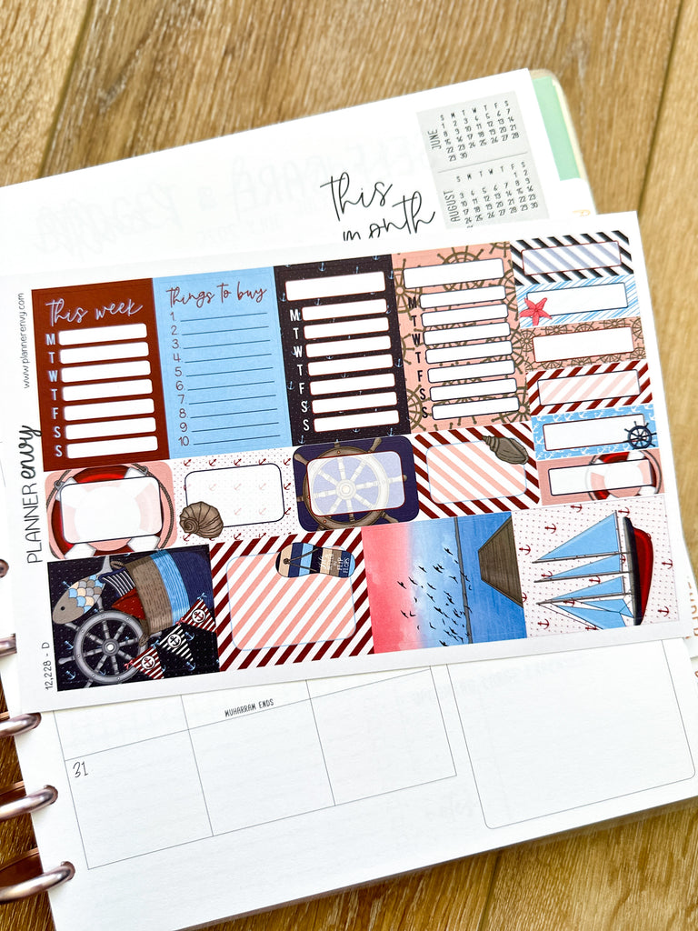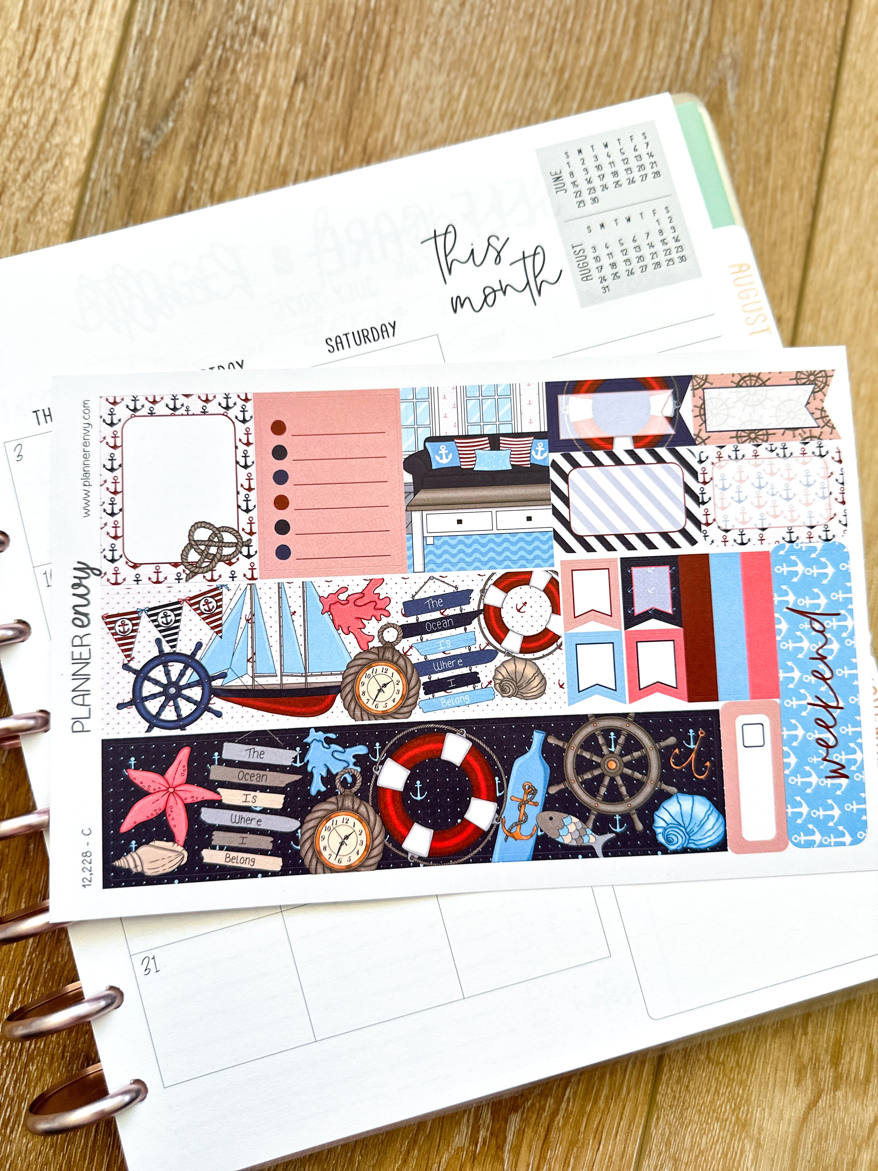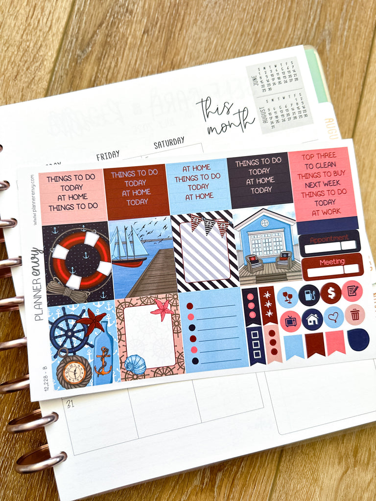 Nautical Beach Sailboats Red Blue Seashells Planner Stickers 4-Page Weekly Kit - 133 Stickers (#12,228)