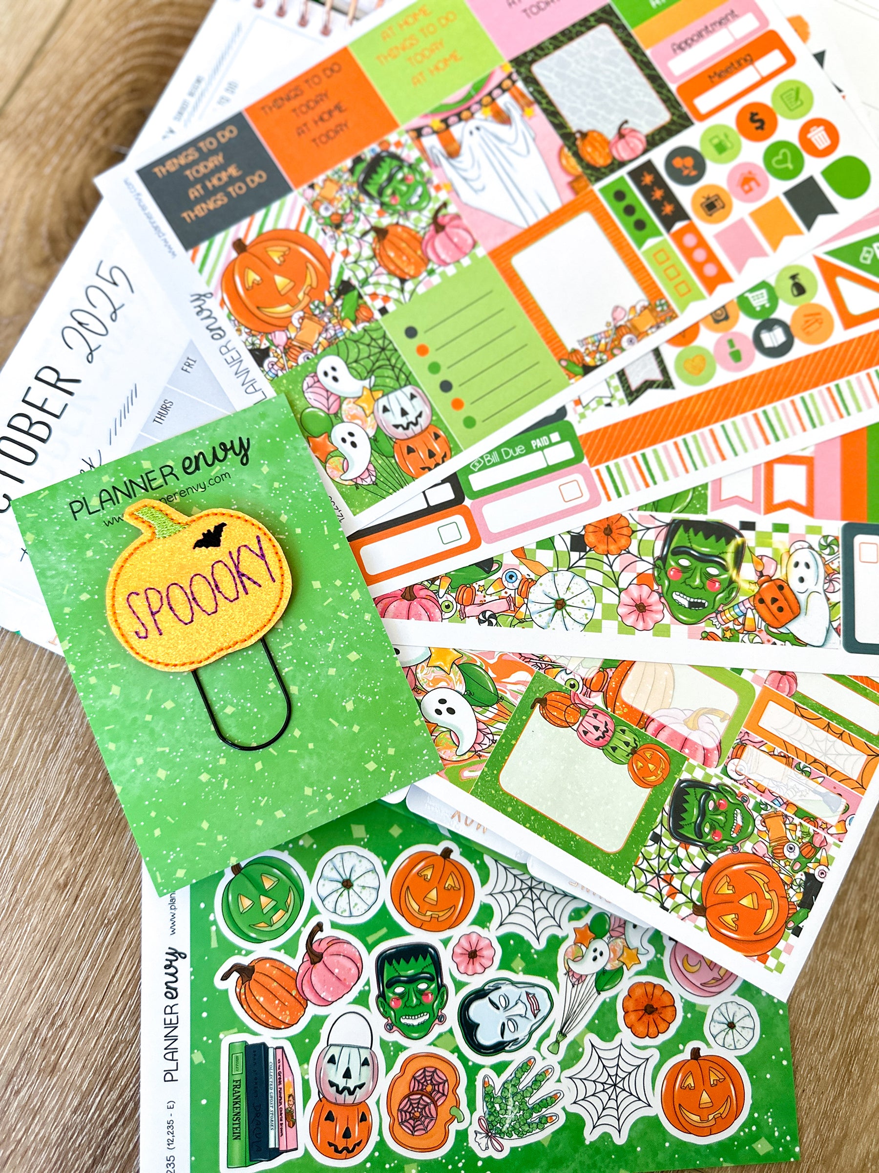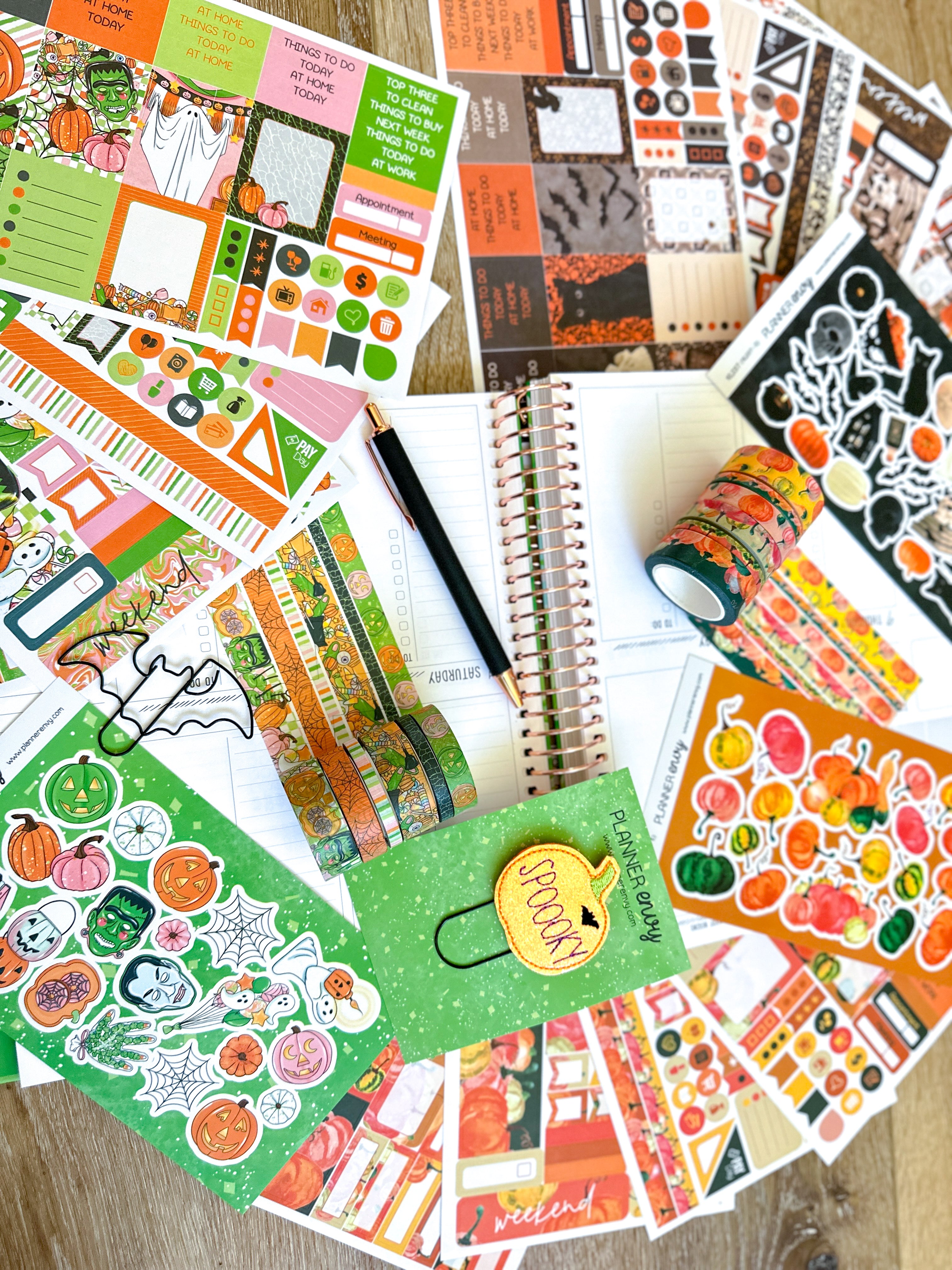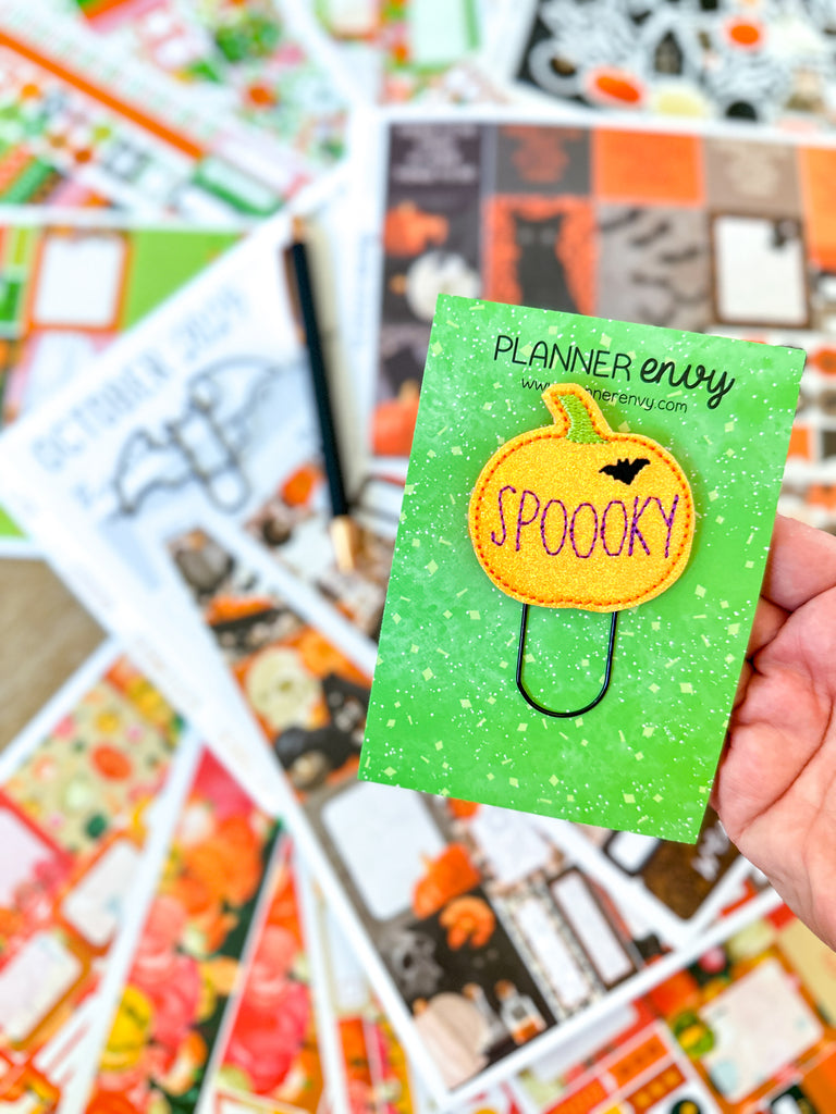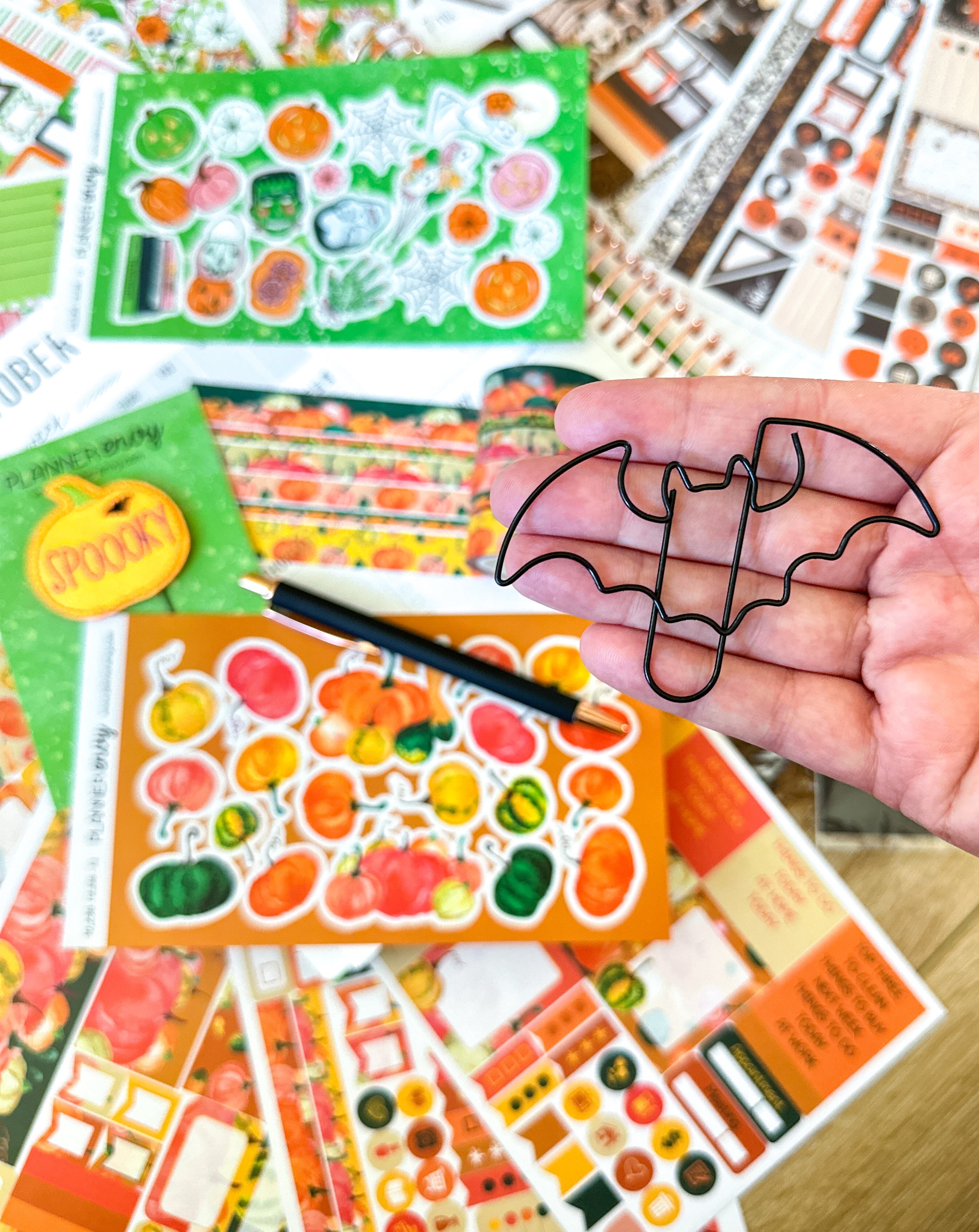 • Planner accessories shown: big shaped bat clip, big pumpkin feltie clip, and pen