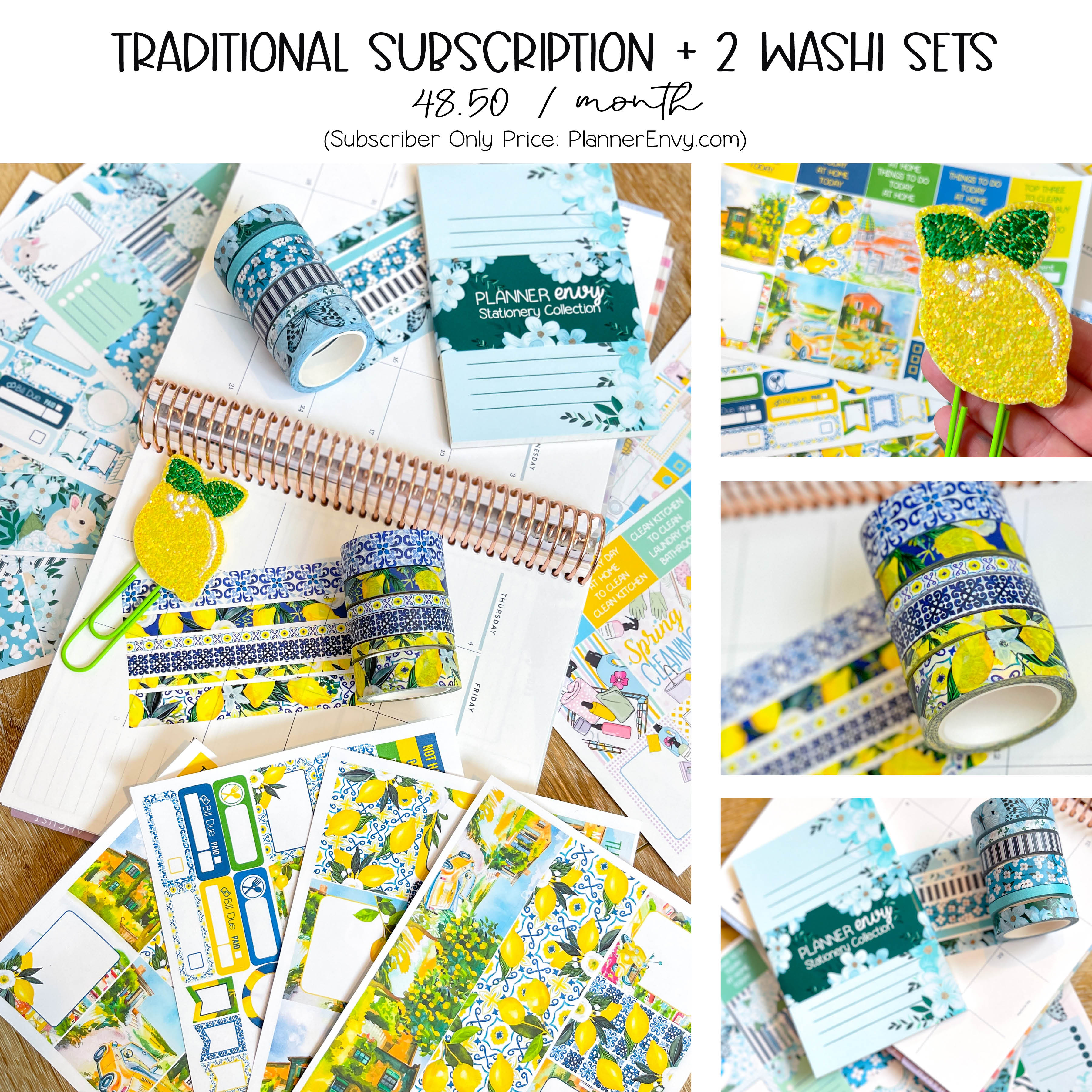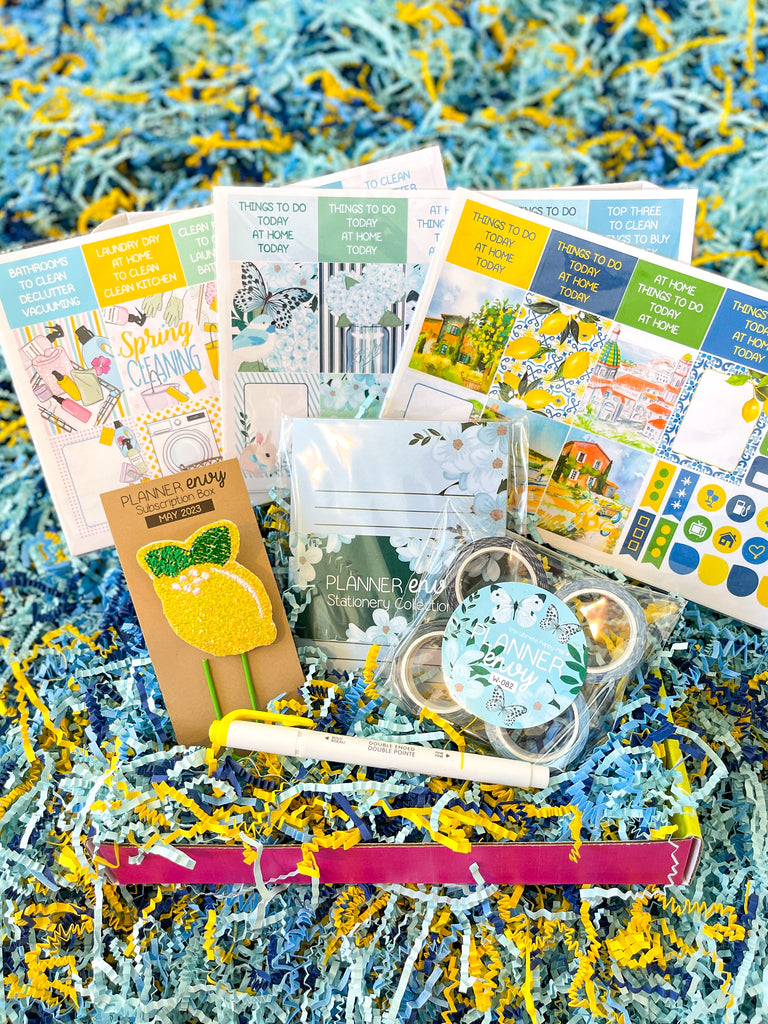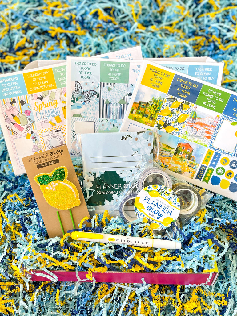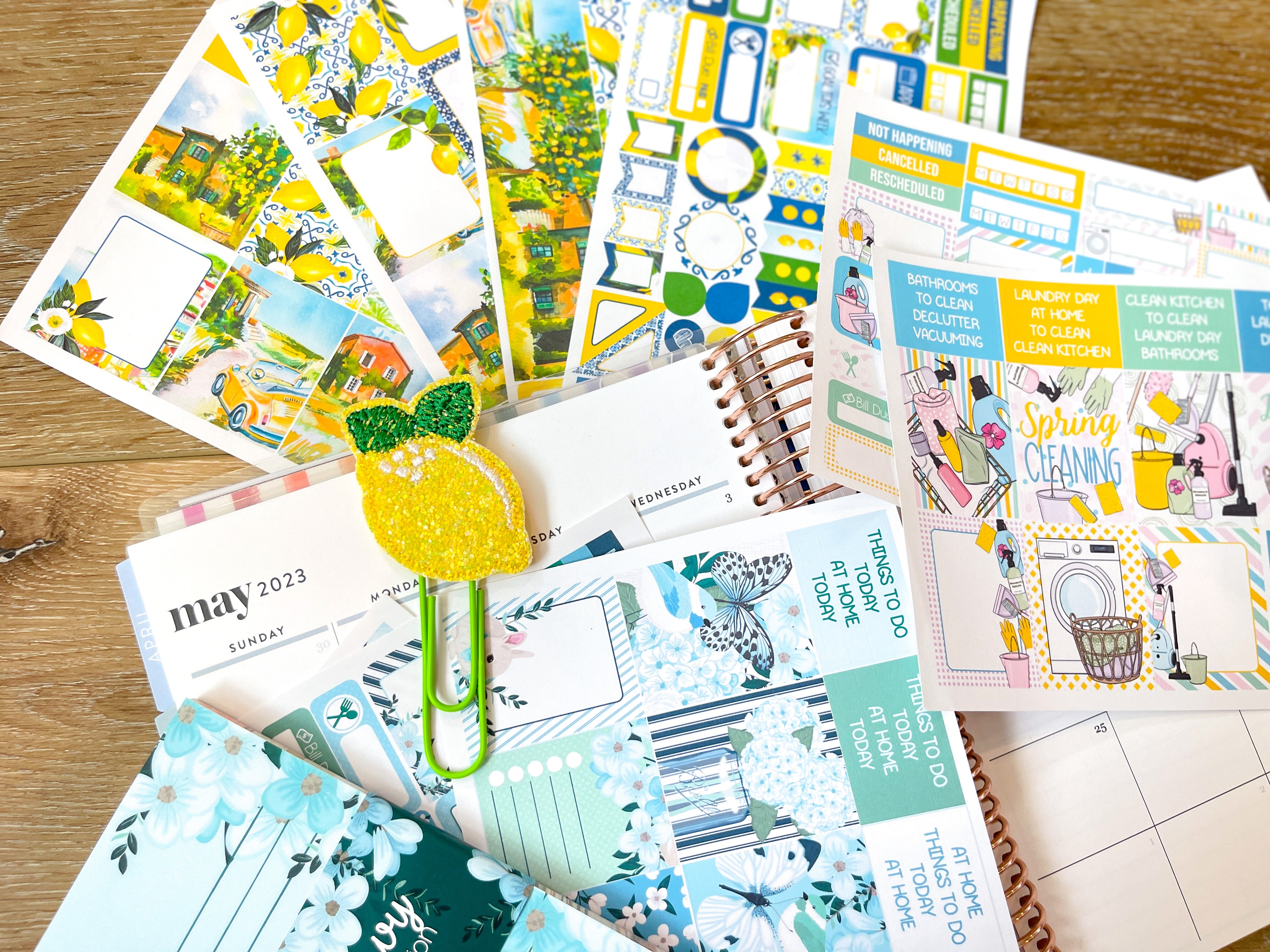 Lemons Italy Tuscany Spring Cleaning Birds Bunnies Light Blue Navy Yellow. May 2023 Planner Envy Subscription Box.