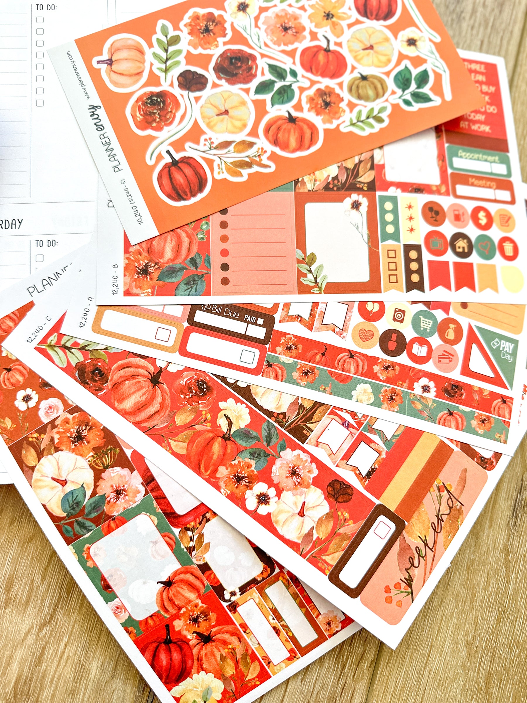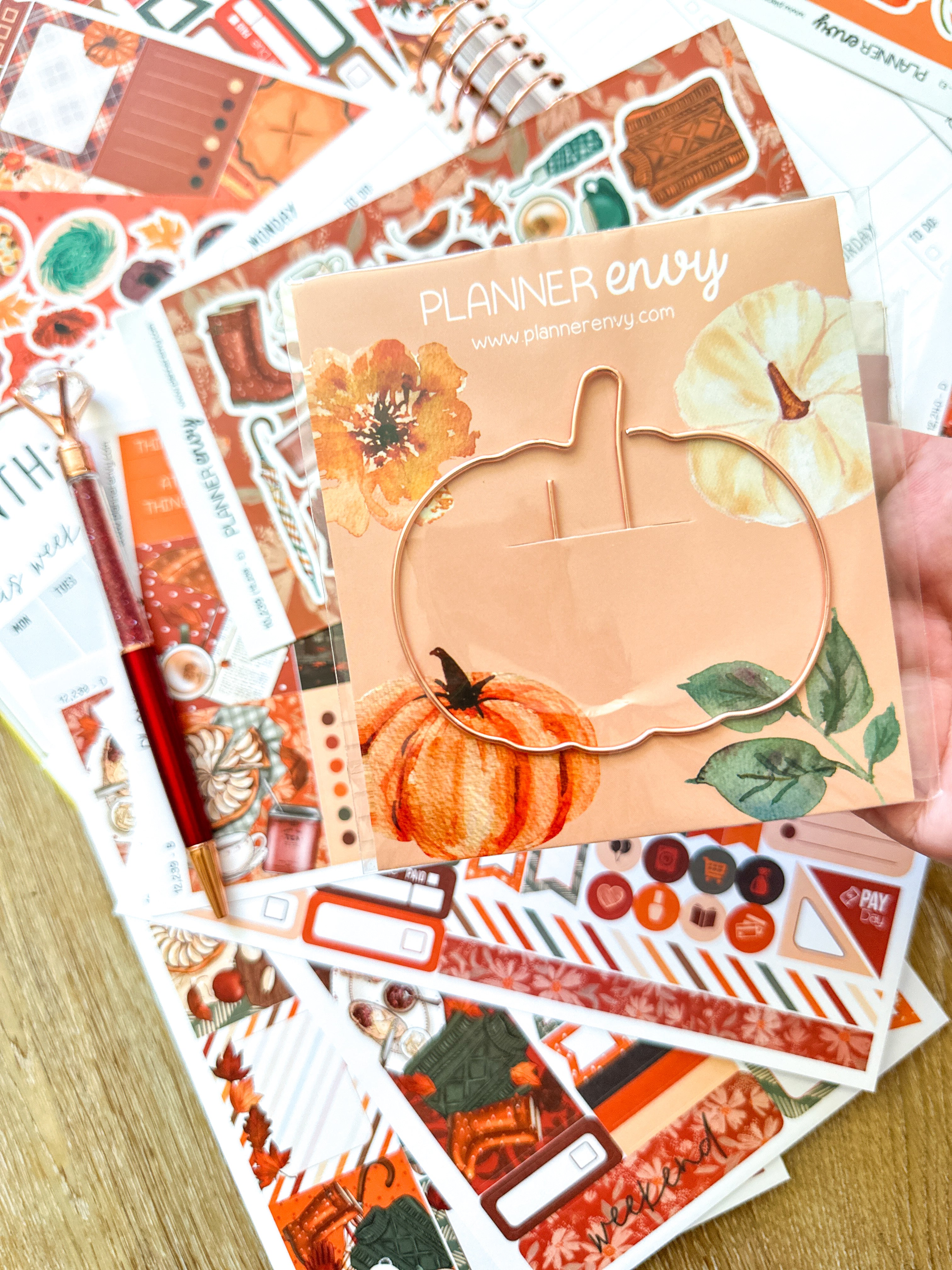• Planner accessories shown: big shaped pumpkin clip, set of 3 sticky notes, and pen