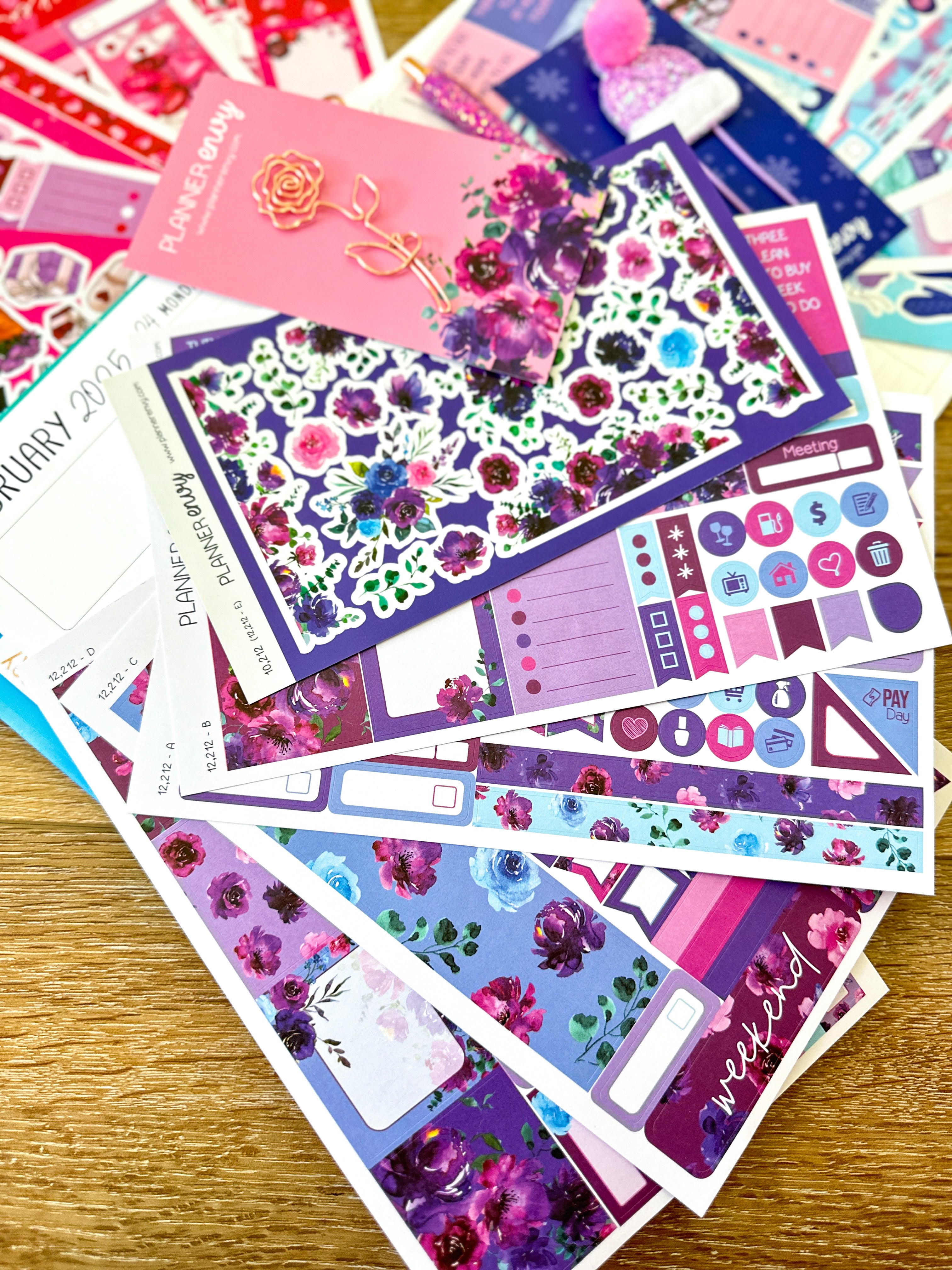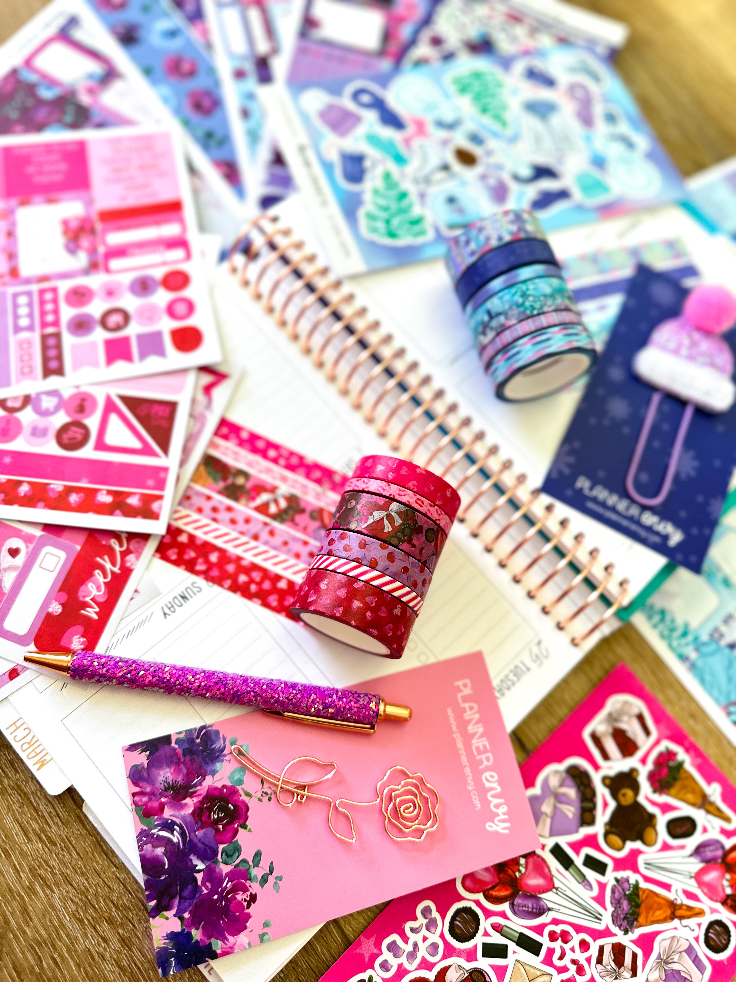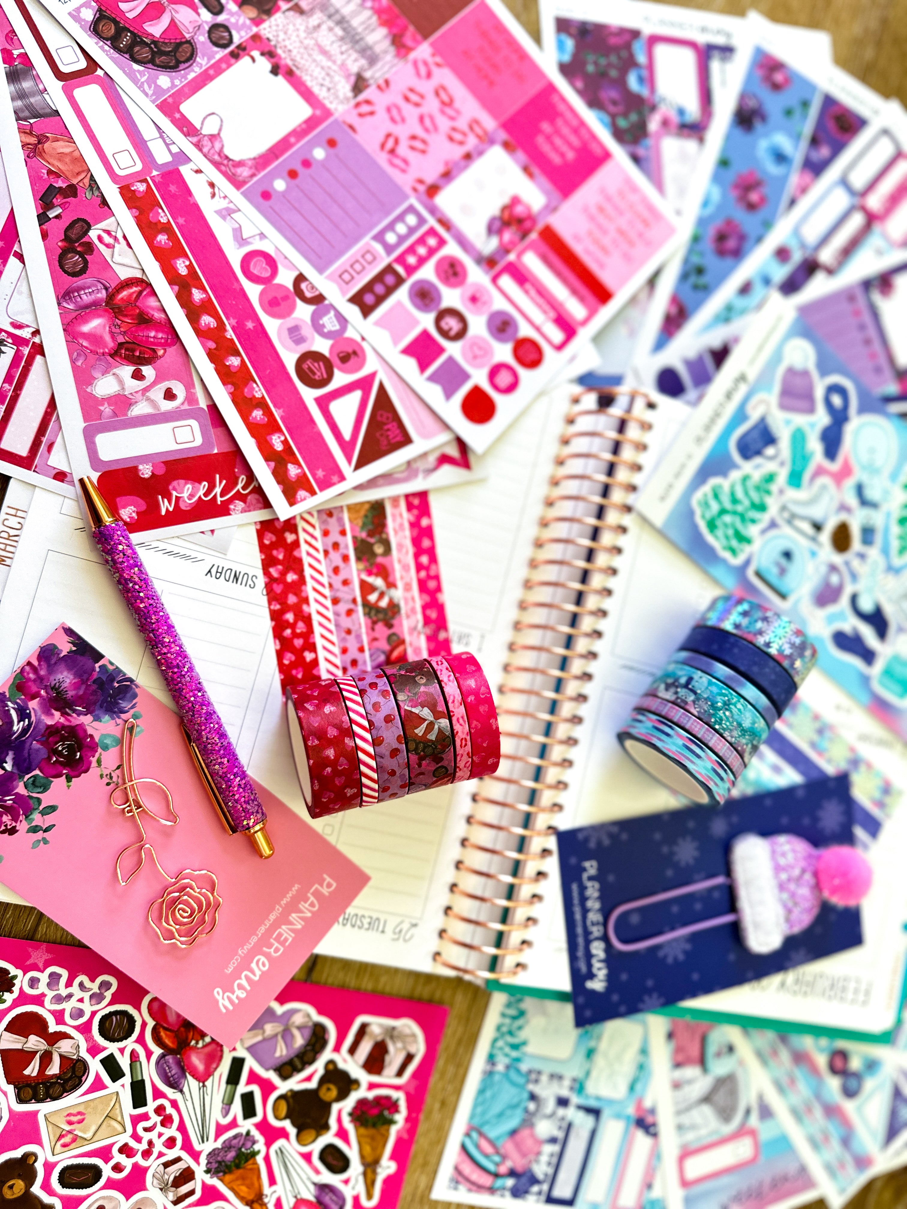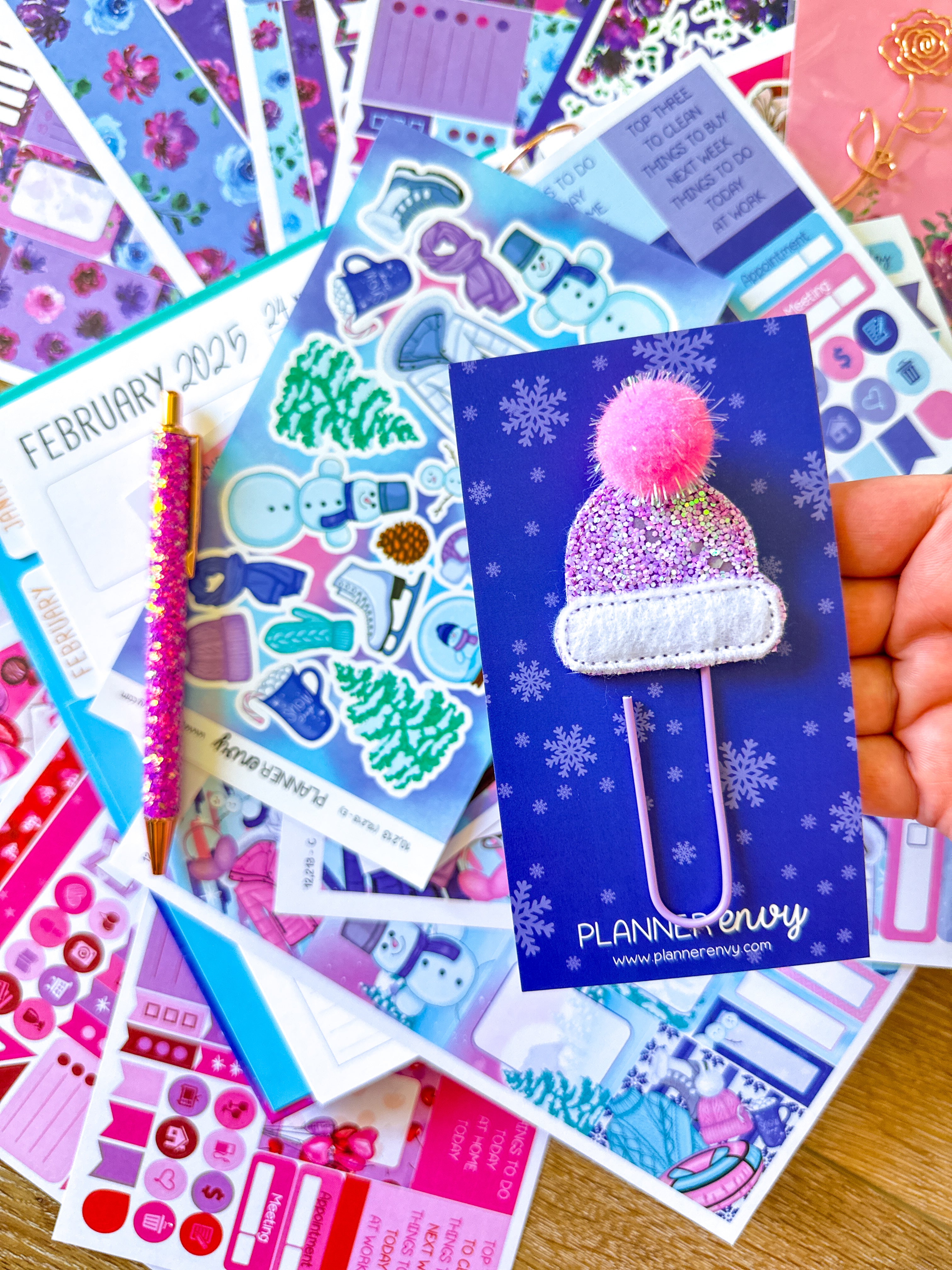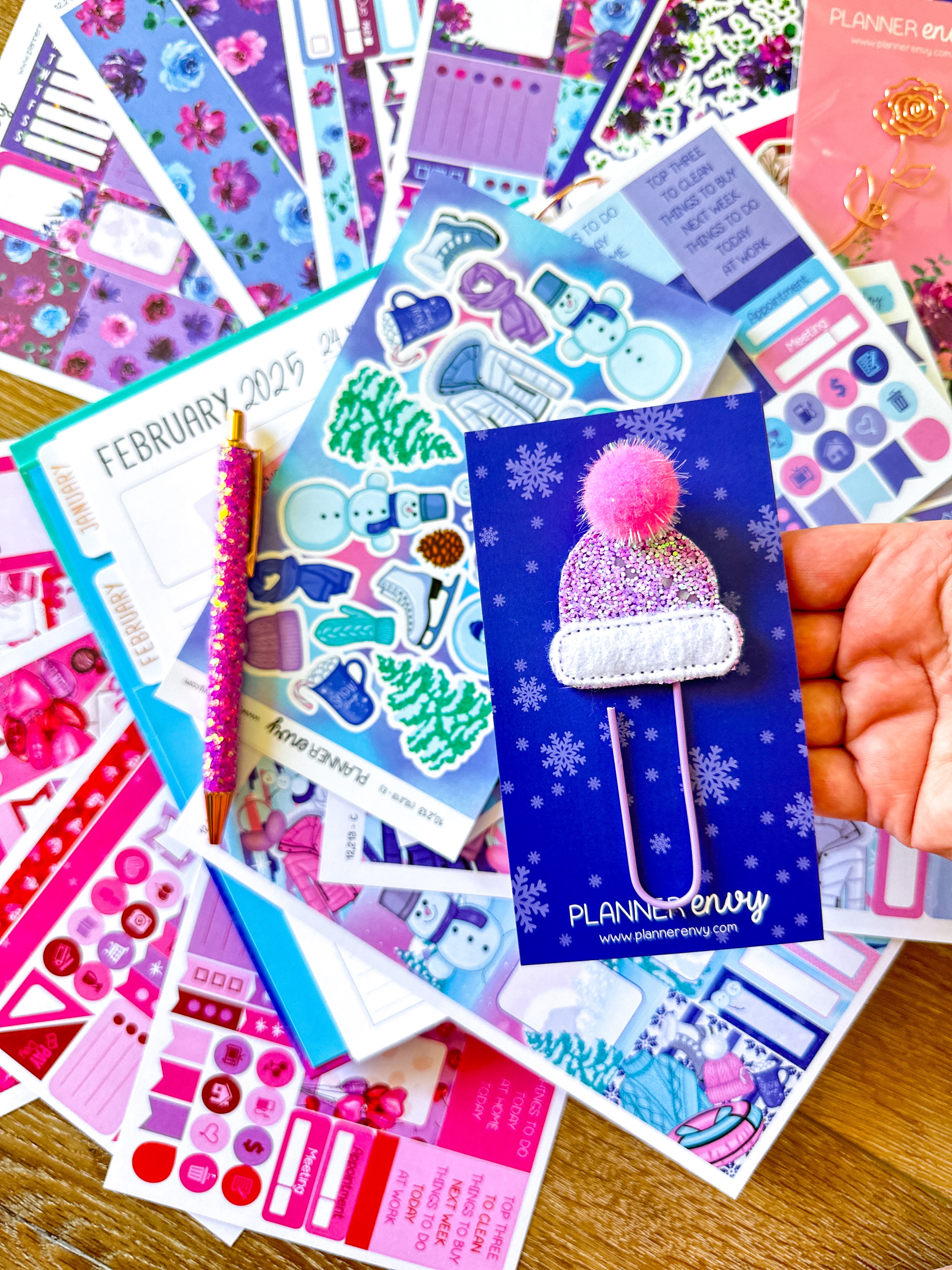 • Planner accessories shown: shaped flower clip, big hat feltie clip, and pen