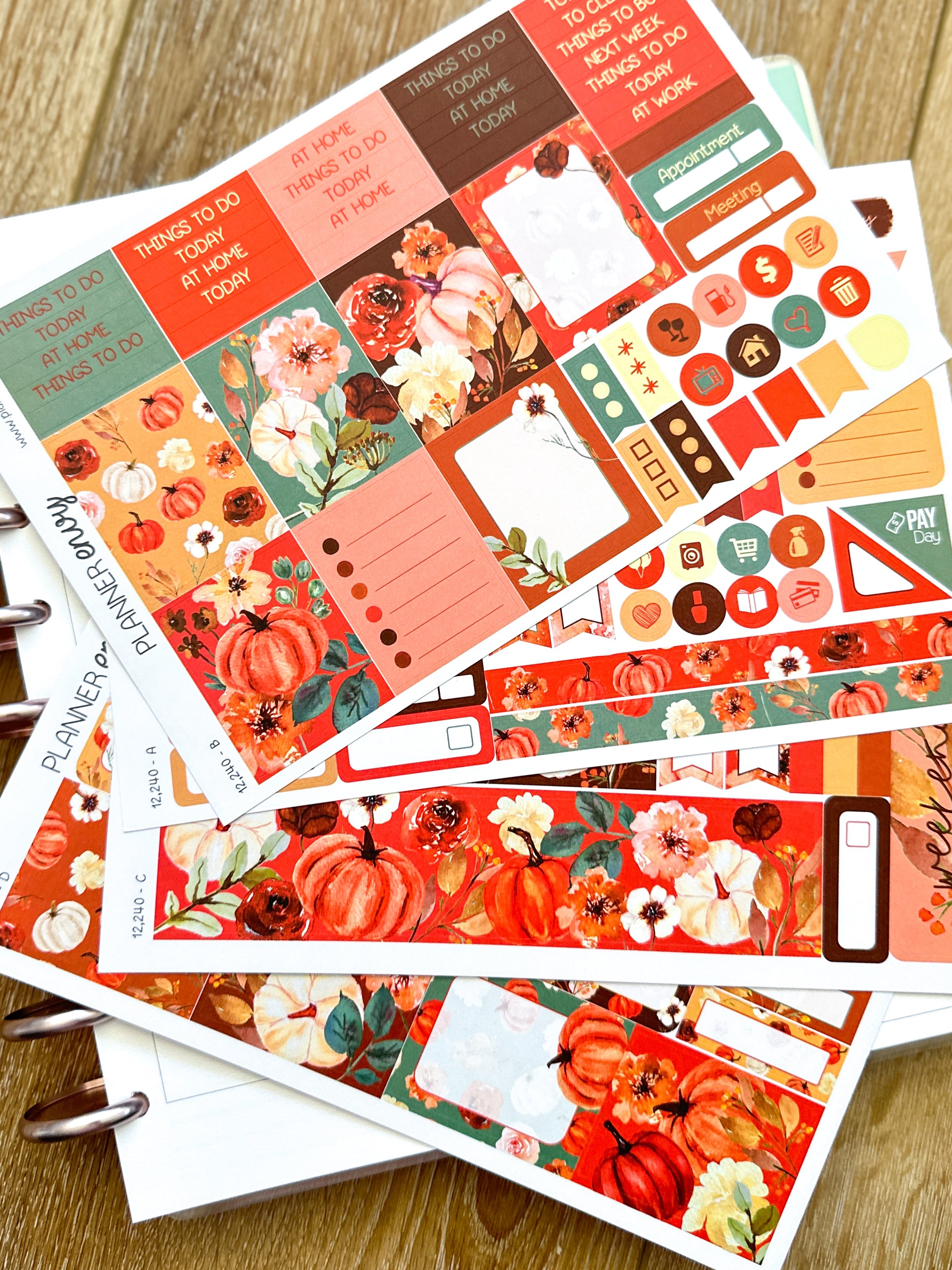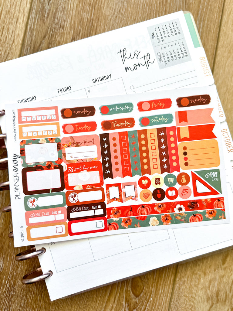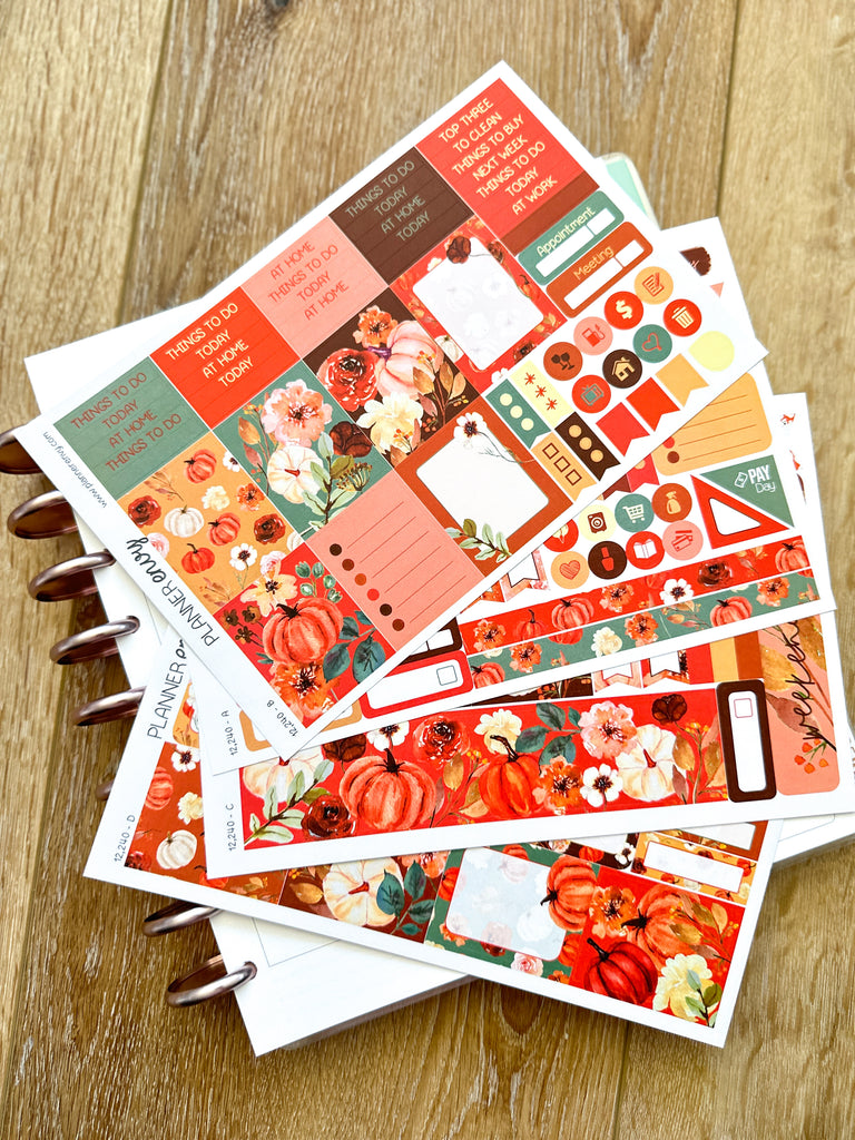 Fall Foliage Pumpkins Florals Cream Rust Orange Flowers Thanksgiving Halloween Planner Stickers 4-Page Weekly Kit - 133 Stickers (#12,240)