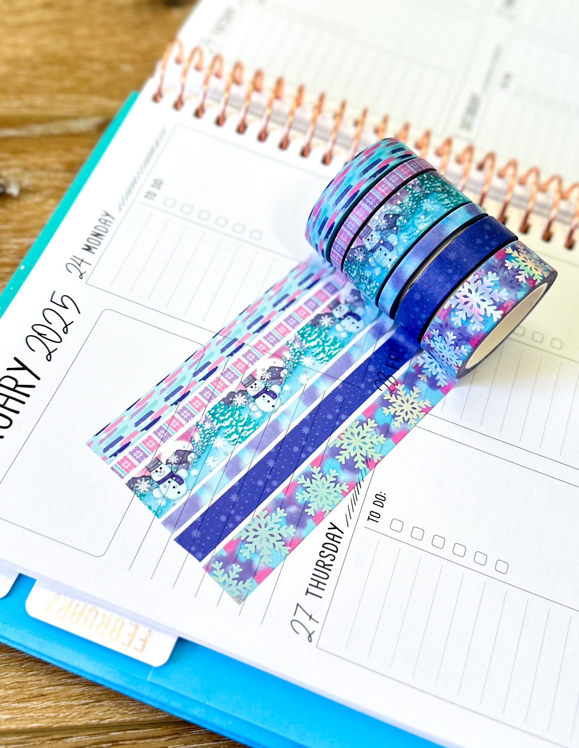 FOILED Silver Snowflakes Snowman Snowmen Snow Pink Purple Blue Washi Tape Set February 2025 - W126