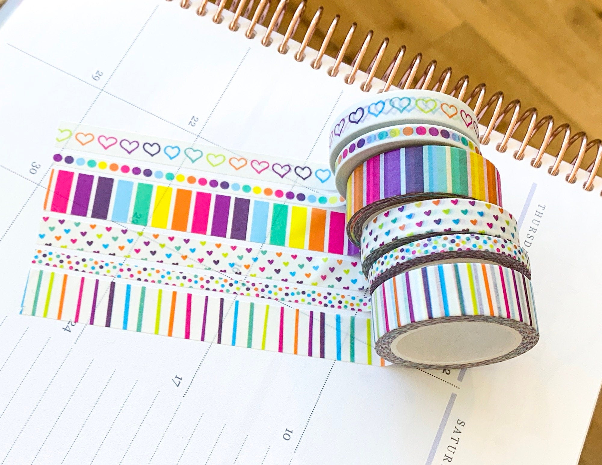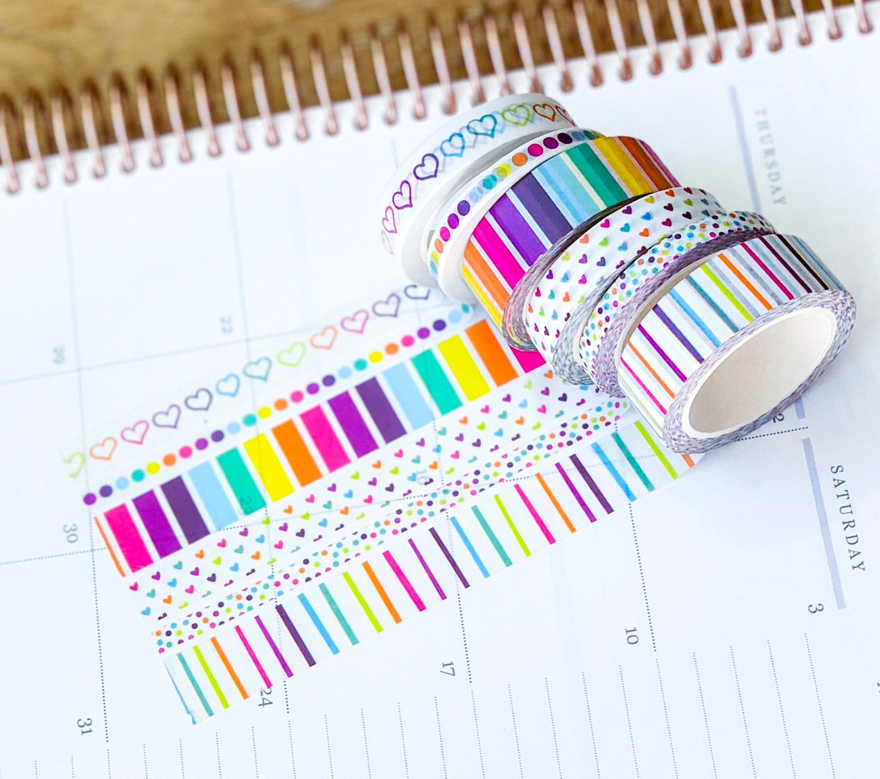 Rainbow Hearts Stripes Bright Polka Dots Washi Tape Set. Planner Envy Washi Set What's included: • 6 total rolls of washi tape • 10 M in length each • 2 rolls of 5 mm • 2 rolls of 10 mm width • 2 rolls of 15 mm width • Each individually packaged in cellophane ................................. Sign up for the monthly billed price of $24.90/month at https://subscribe.plannerenvy.com!