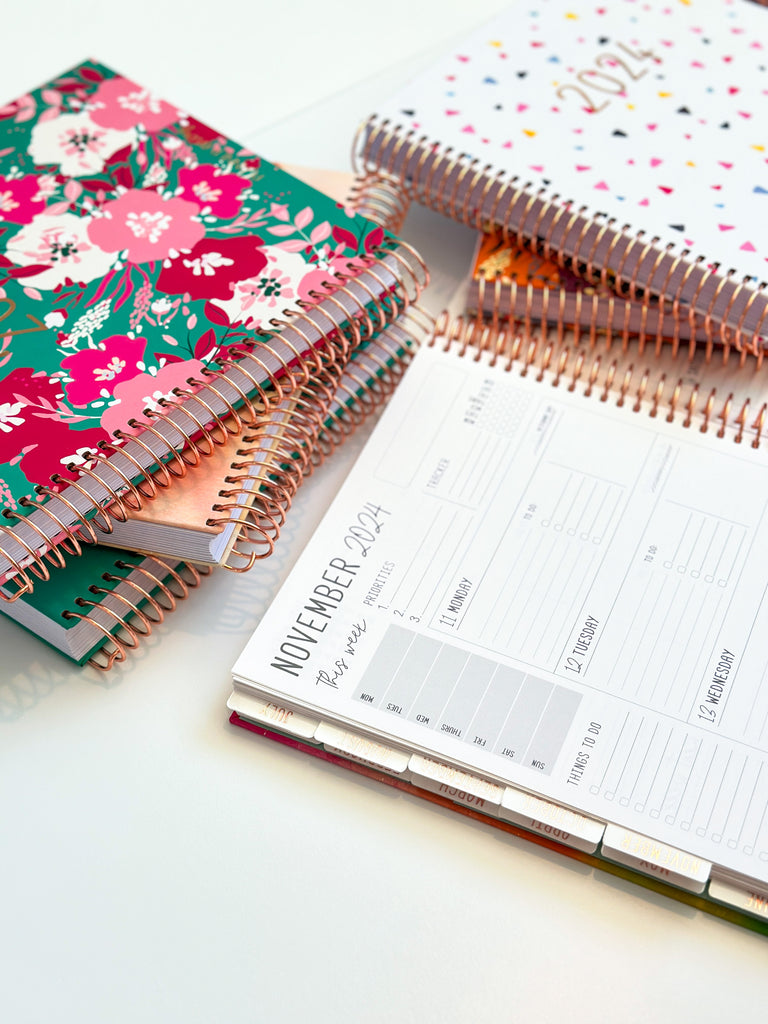 Monthly dashboards, monthly self care and finance pages, monthly calendar layouts, monthly note pages and note pages in the back, a passwords page and address page in the back, a bucket list and book/movie ratings page, PLUS some blank pages.