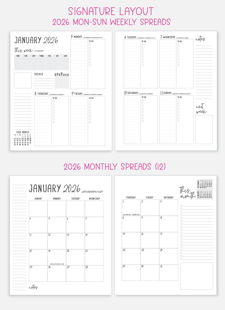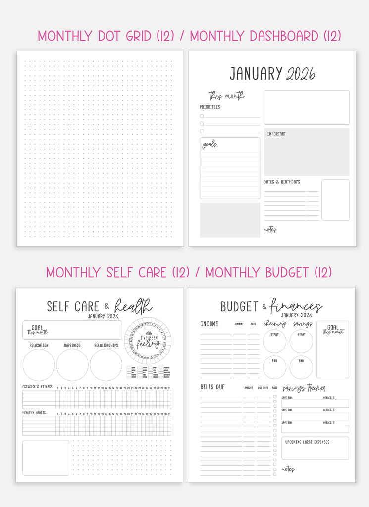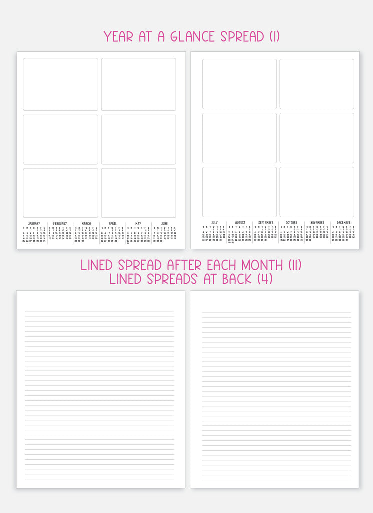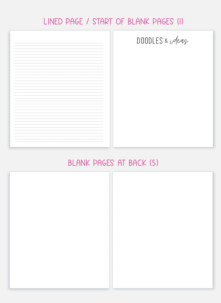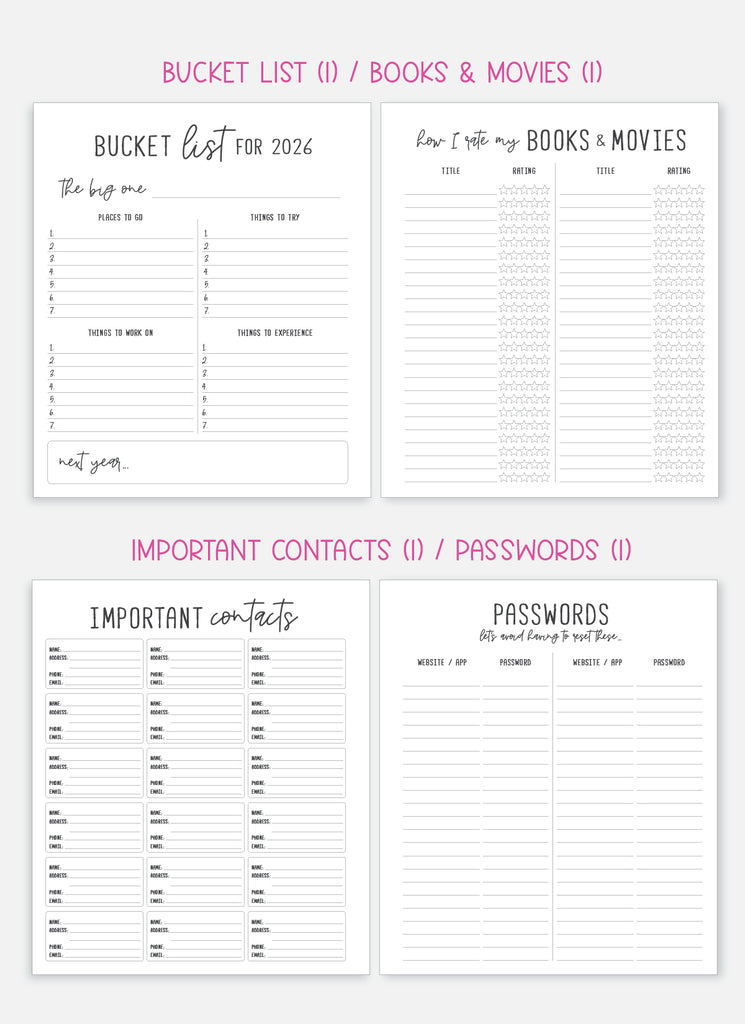 - Extra pages like bucket list, reading/movie ratings, passwords, address list, year at a glance