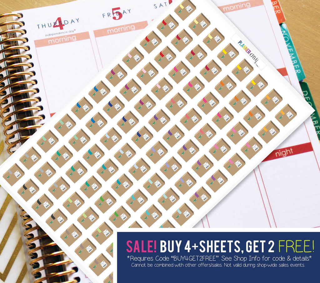 Delivery Package Shipment Planner Stickers To Be Used With Erin Condren LifePlanner (ECLP), Happy Planner - 88 Stickers (#13005) ✦ Each sticker is about 0.7" long x 0.55" wide which fit almost any planner! They fit within the boxes of the Erin Condren vertical LifePlanner, Vertical Recollections planners, Happy Planners, Most Horizontal style planners and work great with many other standard A5 and personal planner sizes too! ✦ Sticker sheet is 5.5 inches wide by 8.5 inches long. ✦ 88 stickers per sheet. ✦ Professionally printed on high quality matte sticker paper. Once these are positioned, they cannot be moved from all papers. If gentle, they can usually be peeled up from the ECLP paper and repositioned. ✦ Bright, vibrant, and ready to make your planner stand out! Check out my reviews to see how bright my stickers are! :) ✦ These do not have any finish and should be easy to write on with most pens - ballpoint pens and fine tip sharpies seem to look the best! ✦ Save on shipping when you buy multiple sheets! *Planner Envy has no affiliation with Erin Condren or Erin Condren LifePlanner. Planner Envy stickers fit the size of Erin Condren planners as well as many others such as Recollections, Happy Planner and standard personal and A5 size planners.* ▶ ▶ ▶ To view more Planner Envy brand stickers, click here to view my shop: https://www.plannerenvy.etsy.com ▶ ▶ ▶ Get deals and coupons codes on Instagram: @planner_envy ▶ ▶ ▶ DEALS & DISCOUNTS ◀◀◀ ✦ Spend $15 or more, get 10% off >> "SAVE10ON15" ✦ Spend $20 or more, get 15% off >> "SAVE15ON20" ✦ Spend $35 or more, get 20% off >> "SAVE20ON35" **ONE COUPON CODE PER TRANSACTION. CANNOT BE COMBINED WITH BUY4GET2FREE** ▶ ▶ ▶ CURRENT SHIPPING TIME ◀◀◀ PLEASE CHECK MY SHOP ANNOUNCEMENT FOR CURRENT SHIPPING & PROCESSING TIME. Planner stickers will usually be shipped within 3-5 business days depending on current orders! Please check my shop homepage and announcement to see my current shipping time and make sure I am not on vacation or out of town. ▶ ▶ ▶ USAGE & COPYRIGHT ◀◀◀ ALL ITEMS ARE FOR PERSONAL USE ONLY. ©Planner Envy All Planner Envy stickers, printed planner pages, notepads and other physical items are for personal use only. No commercial use. They can be used for your personal planner or be gifted for personal use. They are not to be sold as is or manipulated, alone or as part of a group or package, on or off of Etsy.com. Not intended for resale of any kind. ©Planner Envy ▶ ▶ ▶ Check out my other shops! :) ◀◀◀ I am a longtime Etsy seller - check out my main shop for personal and business marketing design templates - VivifyCreative: https://www.etsy.com/shop/VivifyCreative