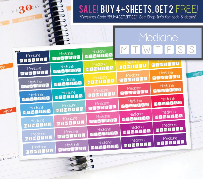 Medicine Week Tracker Planner Stickers to be used with Erin Condren LifePlanner (ECLP), Happy Planner - 44 Sticker ✦ Each sticker is 1.5 inches wide by .5 inch in length. These stickers are perfectly sized to fit the Erin Condren LifePlanner, Happy Planner, and many other standard sized planners - as well as my own planner downloads and printables! ✦ Sticker sheet is 5.5inches wide by 8.5 inches long. ✦ 40 stickers per sheet. ✦ Professionally printed on high quality matte sticker paper. Once these are positioned, they cannot be moved. ✦ Bright, vibrant, and ready to make your planner stand out! Check out my reviews to see how bright and vibrant my stickers are! :) ✦ These do not have any finish and should be easy to write on with most pens - ballpoint pens and fine tip sharpies seem to look the best! ✦ Save on shipping when you buy multiple sheets! *Planner Envy is not affiliated with Erin Condren or Erin Condren LifePlanner. Planner Envy Stickers are sized to fit Erin Condren LifePlanner as well as many other planners such as Happy Planner, Etc.* ▶ ▶ ▶ To view more Planner Envy brand stickers, click here to view my shop: https://www.etsy.com/shop/PlannerEnvy ▶ ▶ ▶ DEALS & DISCOUNTS ◀◀◀ ✦ Spend $15 or more, get 10% off >> "SAVE10ON15" ✦ Spend $20 or more, get 15% off >> "SAVE15ON20" ✦ Spend $35 or more, get 20% off >> "SAVE20ON25" **ONE COUPON CODE PER TRANSACTION** ▶ ▶ ▶ CURRENT SHIPPING TIME ◀◀◀ PLEASE CHECK MY SHOP ANNOUNCEMENT FOR CURRENT SHIPPING & PROCESSING TIME. Planner stickers will usually be shipped within 3-5 business days depending on current orders! Please check my shop homepage and announcement to see my current shipping time and make sure I am not on vacation or out of town. ▶ ▶ ▶ USAGE & COPYRIGHT ◀◀◀ ALL ITEMS ARE FOR PERSONAL USE ONLY. ©Planner Envy All Planner Envy stickers, printed planner pages, notepads and other physical items are for personal use only. No commercial use. They can be used for your personal planner or be gifted for personal use. They are not to be sold as is or manipulated, alone or as part of a group or package, on or off of Etsy.com. Not intended for resale of any kind. ©Planner Envy ▶ ▶ ▶ Check out my other shops! :) ◀◀◀ I am a longtime Etsy seller - check out my main shop for personal and business marketing design templates - VivifyCreative: https://www.etsy.com/shop/VivifyCreative