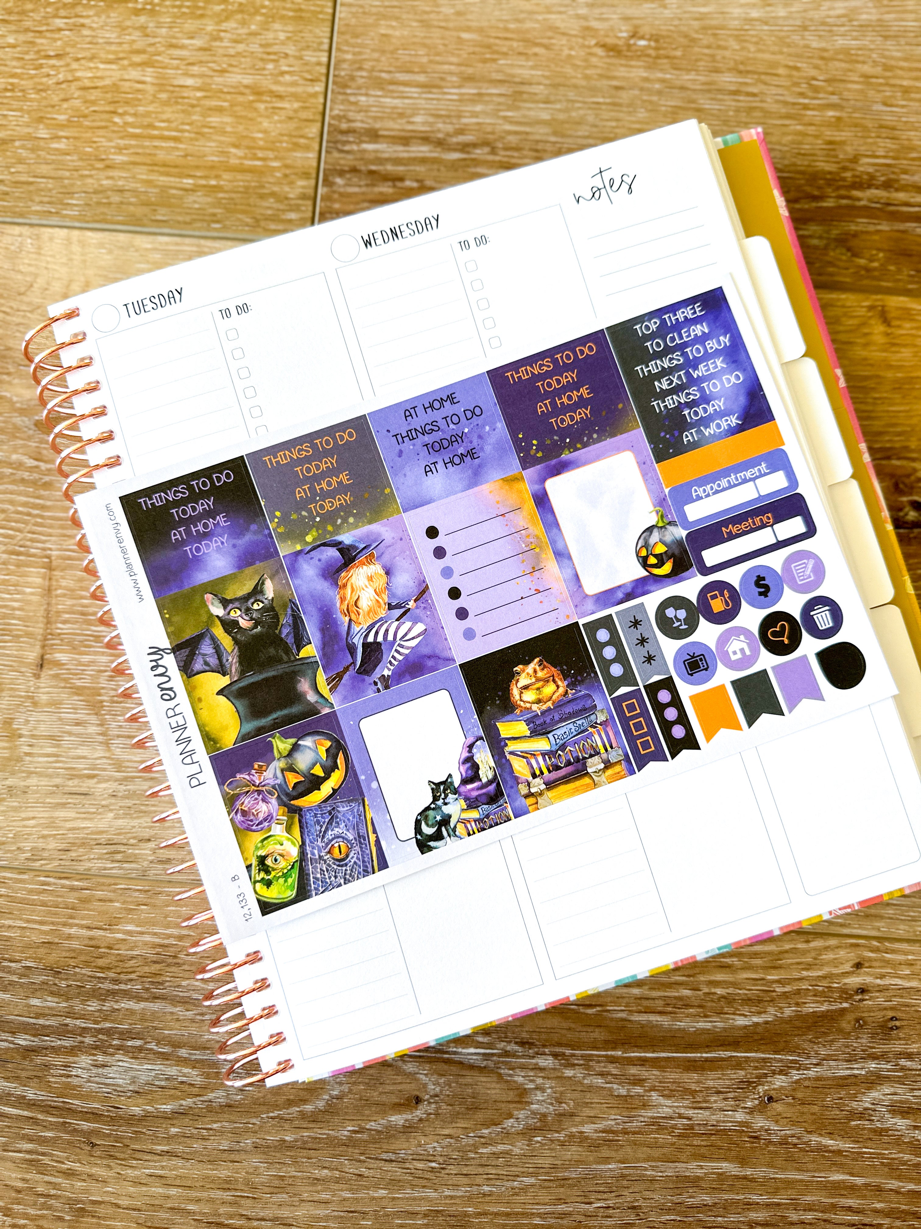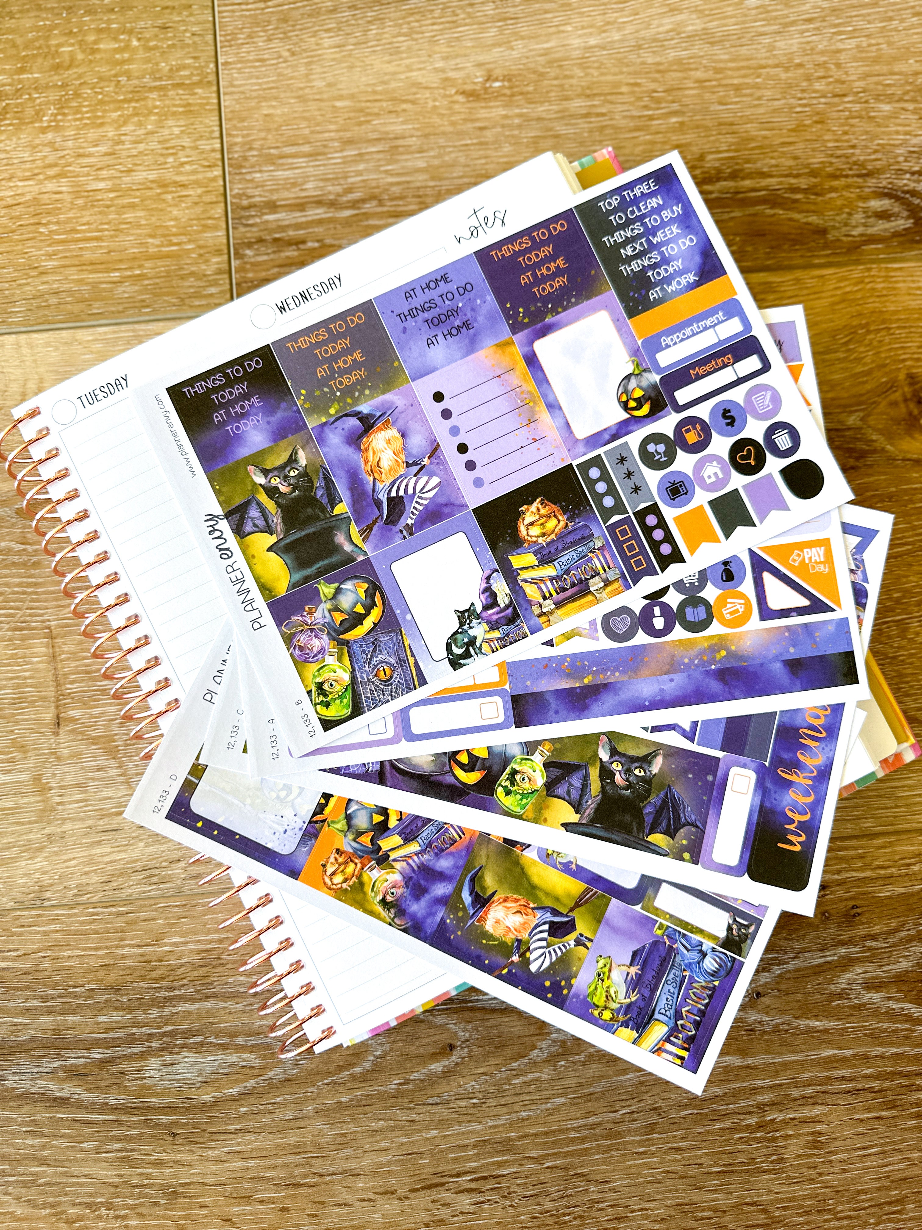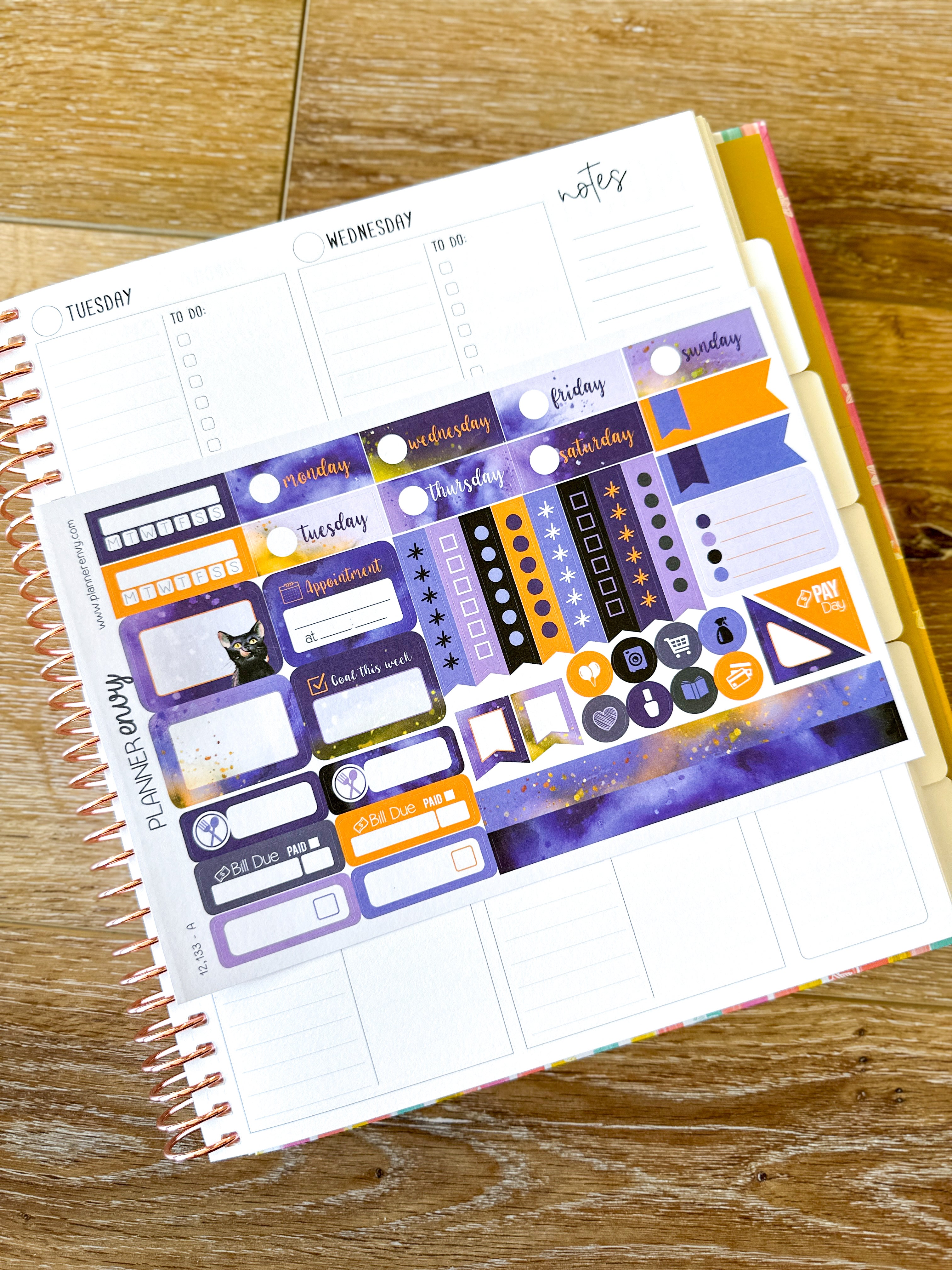 NEW KIT FORMAT! Halloween Purple Black Cats Pumpkins Spooky Planner Stickers Weekly Kit - 133 Stickers (#12,133)