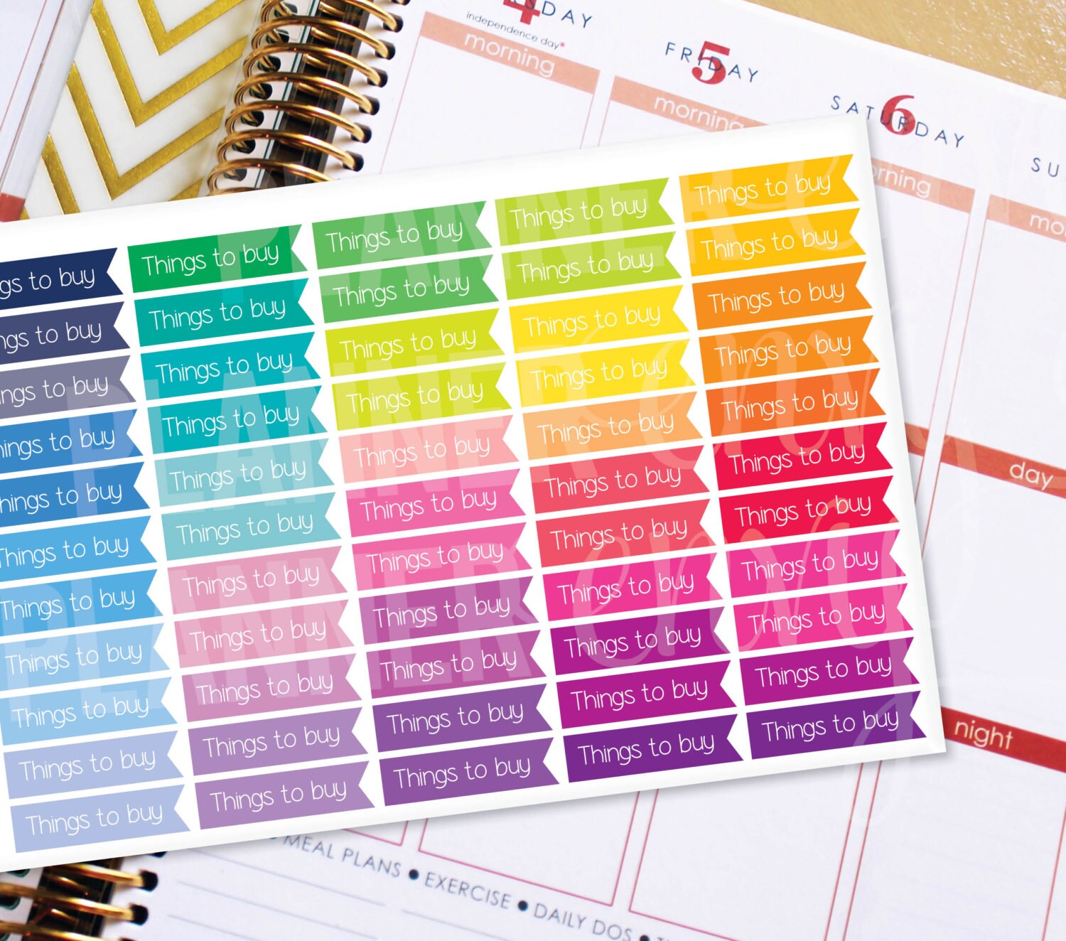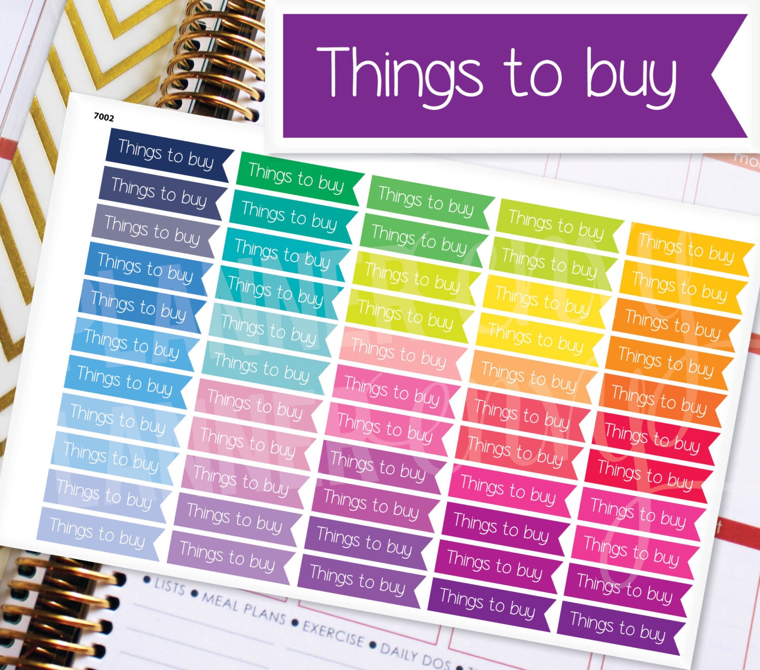 Planner Stickers Erin Condren Life Planner - 55 Things To Buy Flag Header Stickers ✦ Each sticker is just under 1.5 inches wide (1.425 inches wide) by 0.35 inches in length to perfectly fit Erin Condren vertical life planners as well as the boxes on many of my own planners, planner downloads and notepads! ✦ Sticker sheet is 5.5 inches wide by 8.5 inches long. ✦ 55 stickers per sheet. ✦ Professionally printed on matte sticker paper. Once these are positioned, they cannot be moved. ✦ Bright, vibrant, and ready to make your planner stand out! ✦ These do not have any finish and should be easy to write on with most pens - ballpoint pens and fine tip sharpies seem to look the best! ✦ Save on shipping when you buy multiple sheets! ▶ ▶ ▶ To view more Planner Envy brand stickers, click here to view my shop: https://www.etsy.com/shop/PlannerEnvy ▶ ▶ ▶ DEALS & DISCOUNTS ◀◀◀ ✦ Spend $15 or more, get 10% off >> "SAVE10ON15" ✦ Spend $20 or more, get 15% off >> "SAVE15ON20" ✦ Spend $35 or more, get 20% off >> "SAVE20ON25" **ONE COUPON CODE PER TRANSACTION** ▶ ▶ ▶ CURRENT SHIPPING TIME ◀◀◀ PLEASE CHECK MY SHOP ANNOUNCEMENT FOR CURRENT SHIPPING & PROCESSING TIME. Planner stickers will usually be shipped within 3-5 business days depending on current orders! Please check my shop homepage and announcement to see my current shipping time and make sure I am not on vacation or out of town. ▶ ▶ ▶ USAGE & COPYRIGHT ◀◀◀ ALL ITEMS ARE FOR PERSONAL USE ONLY. ©Planner Envy All Planner Envy stickers, printed planner pages, notepads and other physical items are for personal use only. No commercial use. They can be used for your personal planner or be gifted for personal use. They are not to be sold as is or manipulated, alone or as part of a group or package, on or off of Etsy.com. Not intended for resale of any kind. ©Planner Envy ▶ ▶ ▶ Check out my other shops! :) ◀◀◀ I am a longtime Etsy seller - check out my main shop for personal and business marketing design templates - VivifyCreative: https://www.etsy.com/shop/VivifyCreative