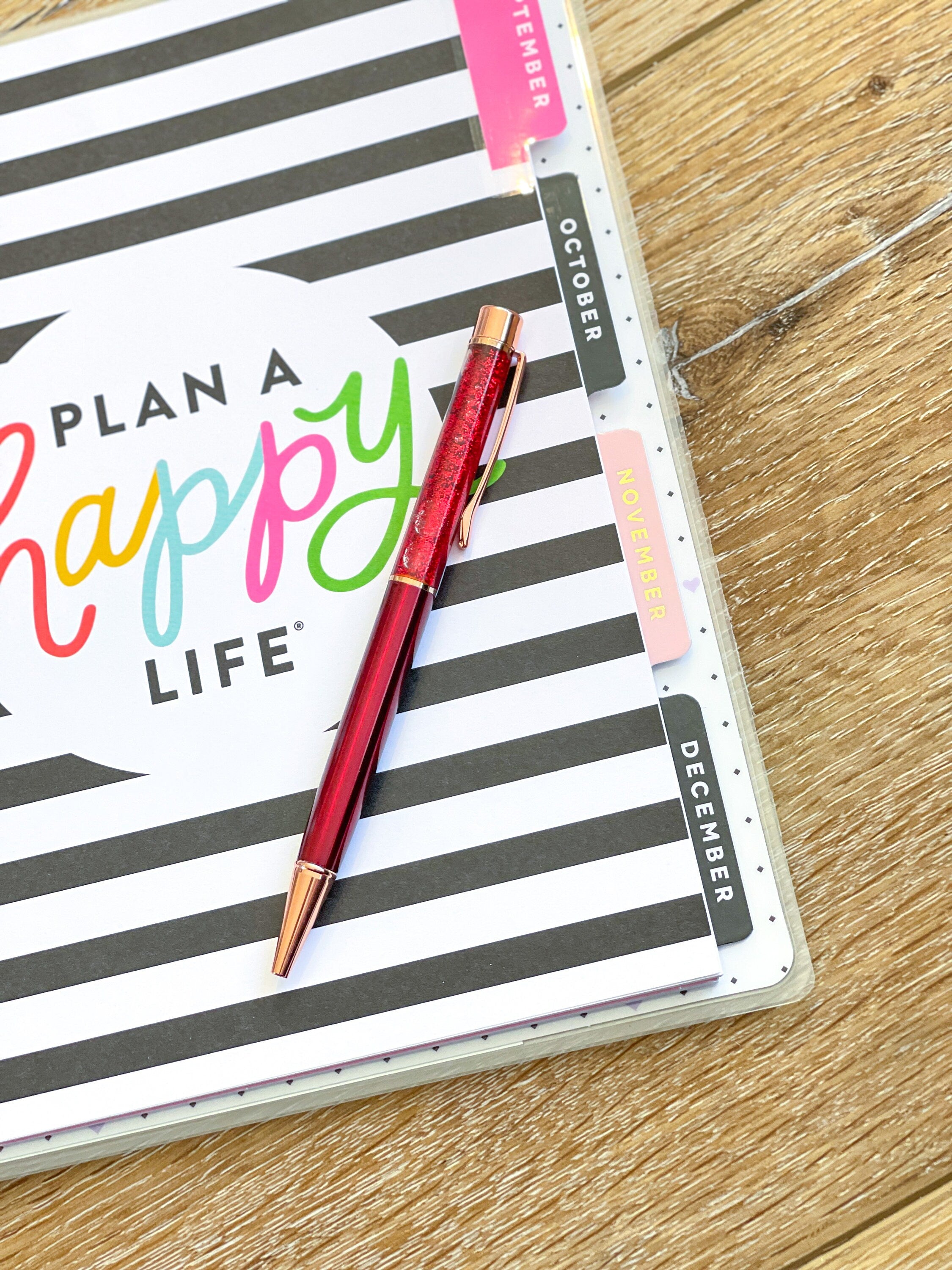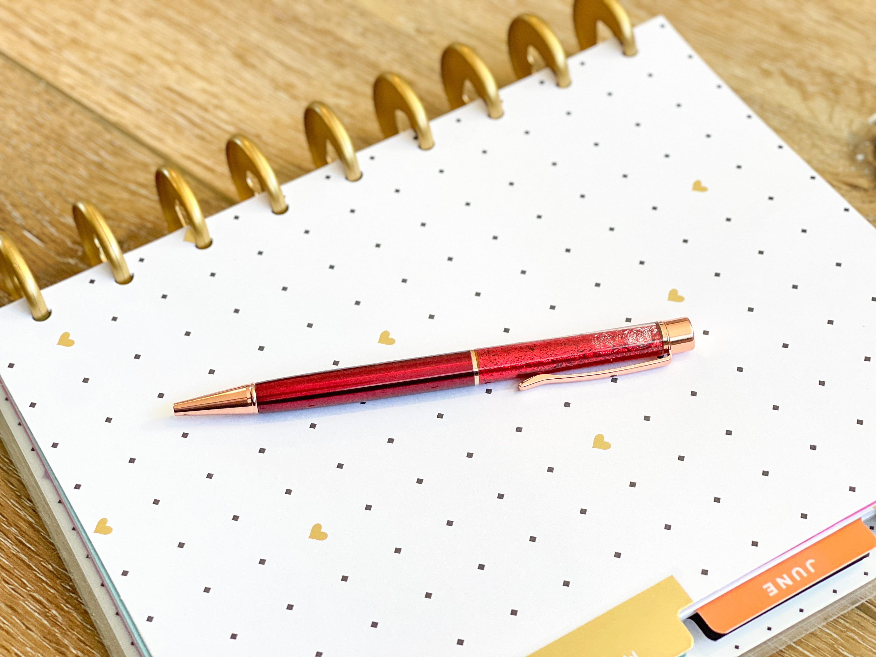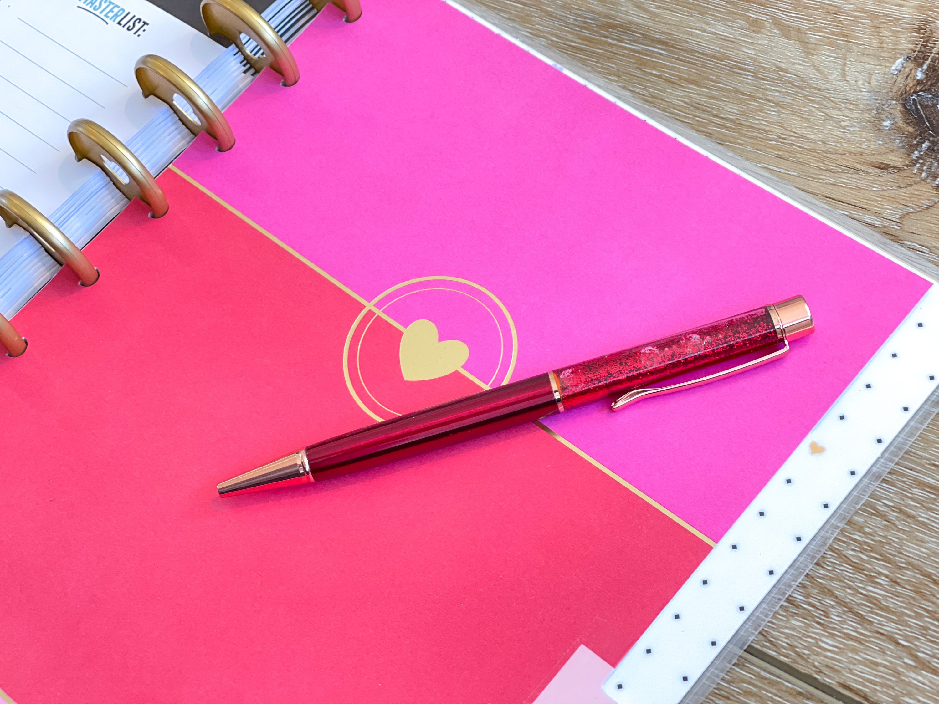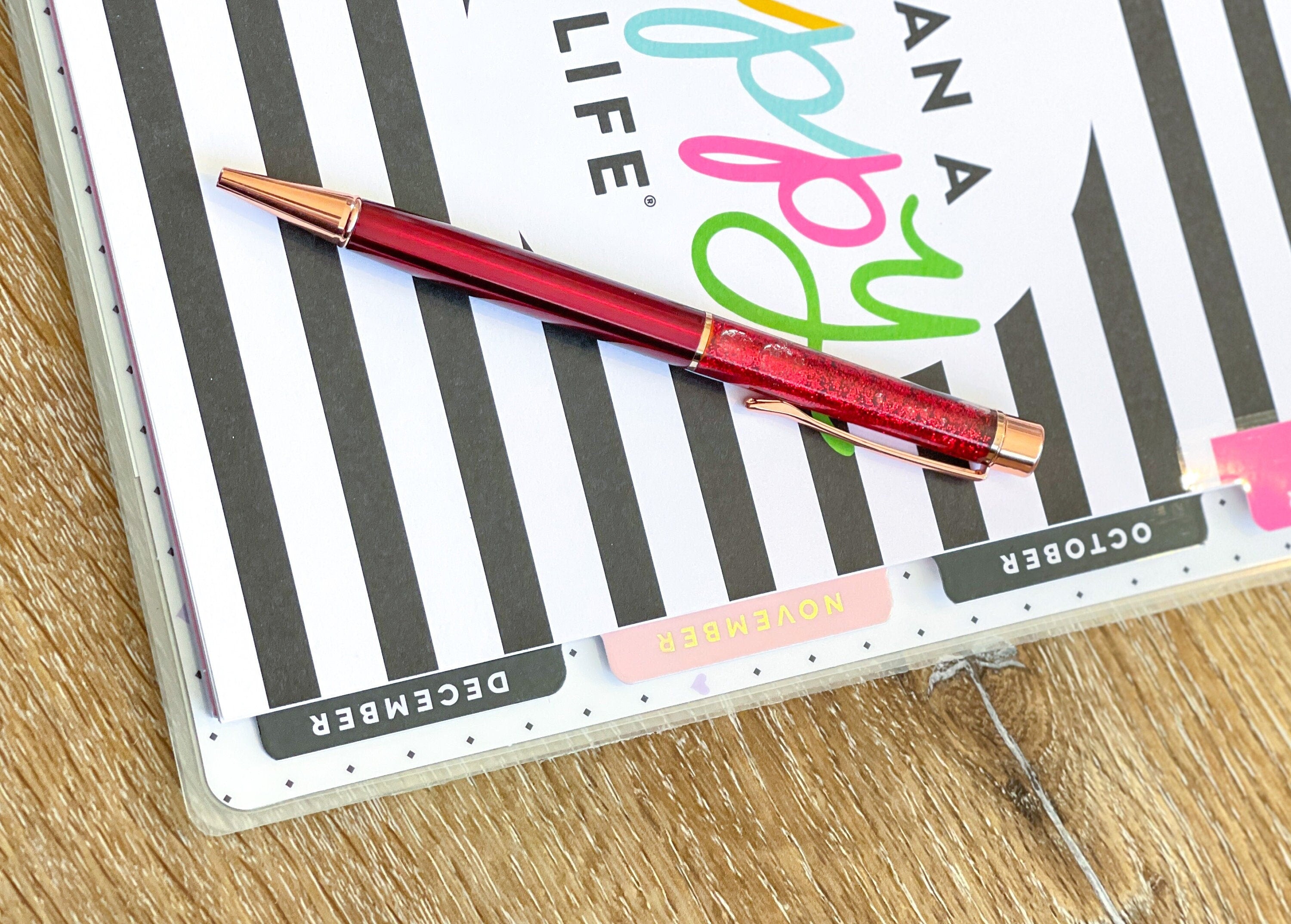 Red Glitter Rose Gold Pen Planner Ballpoint Black Ink Pen Christmas Engagement Wedding New Job Promotion Stationery Gift - P042 This will be your new favorite pen, and it makes a great gift! What's included: • 1 of the pens in the photos *Please note that if multiple pens are pictured, or if anything else is in the photo, it is to style the photo. No planners or other items included.