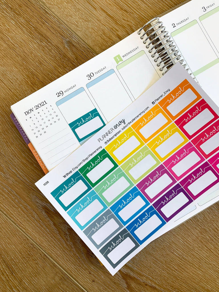 School Homeschool Schedule Planner Stickers to be used with Erin Condren ECLP, Happy Planner, Recollections (#1038) ✦ Each sticker is 1.5 inches wide by 1 inch in length. These stickers are perfectly sized to fit in the boxes of: ▶The Original Size Erin Condren Vertical Life Planner ▶The Medium Size Happy Planner ▶The Medium Size Vertical Recollections Planner ✦ Sticker sheet is 5.5inches wide by 8.5 inches long. ✦ 20 stickers per sheet. ✦ Professionally printed on matte sticker paper. Once these are positioned, they cannot always be moved. They do seem to pull up pretty easily and can be re-stuck to the pages of the ECLP & Happy Planner, but do not pull up cleanly from Recollections or from on top of other stickers. ✦ Bright, vibrant, and ready to make your planner stand out! ✦ These do not have any finish and should be easy to write on with most pens - ballpoint pens and fine tip sharpies seem to look the best! ✦ Save on shipping when you buy multiple sheets! ▶ ▶ ▶ To view more Planner Envy brand stickers, click here to view my shop: https://www.etsy.com/shop/PlannerEnvy ▶ ▶ ▶ DEALS & DISCOUNTS ◀◀◀ ✦ Spend $15 or more, get 10% off >> "SAVE10ON15" ✦ Spend $20 or more, get 15% off >> "SAVE15ON20" ✦ Spend $35 or more, get 20% off >> "SAVE20ON35" **ONE COUPON CODE PER TRANSACTION** ▶ ▶ ▶ CURRENT SHIPPING TIME ◀◀◀ Planner stickers will usually be shipped within 3-5 business days depending on current orders! Please check my shop homepage and announcement to see my current shipping time and make sure I am not on vacation or out of town. ▶ ▶ ▶ USAGE & COPYRIGHT ◀◀◀ ALL ITEMS ARE FOR PERSONAL USE ONLY. © Planner Envy PRINTED PAGES, STICKERS AND OTHER PHYSICAL ITEMS All of my physical items are for person use only. No commercial use. They can be used for your personal planner or be gifted for personal use. They are not to be sold as is or manipulated, alone or as part of a group or package, on or off of Etsy.com. Not intended for resale of any kind. © 2015 Planner Envy