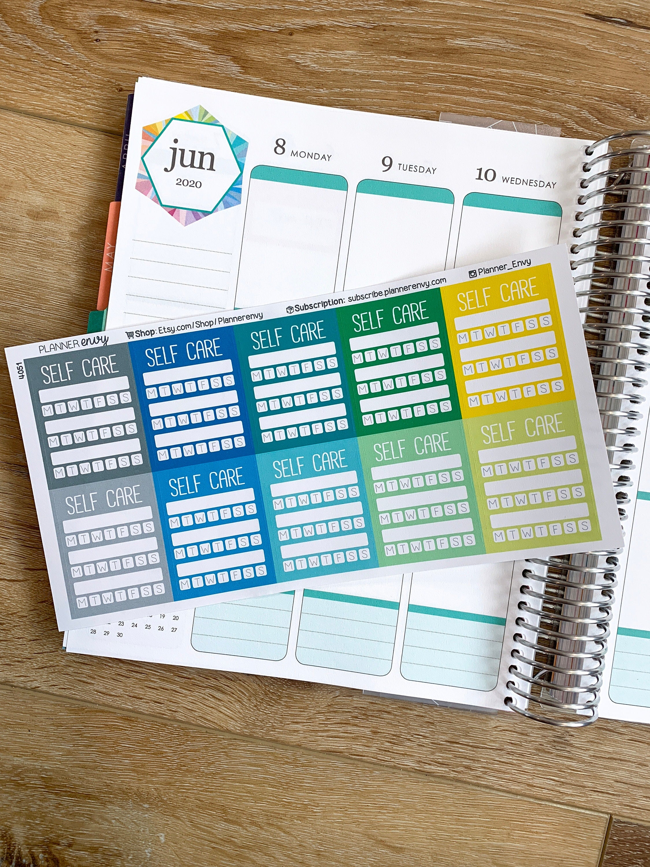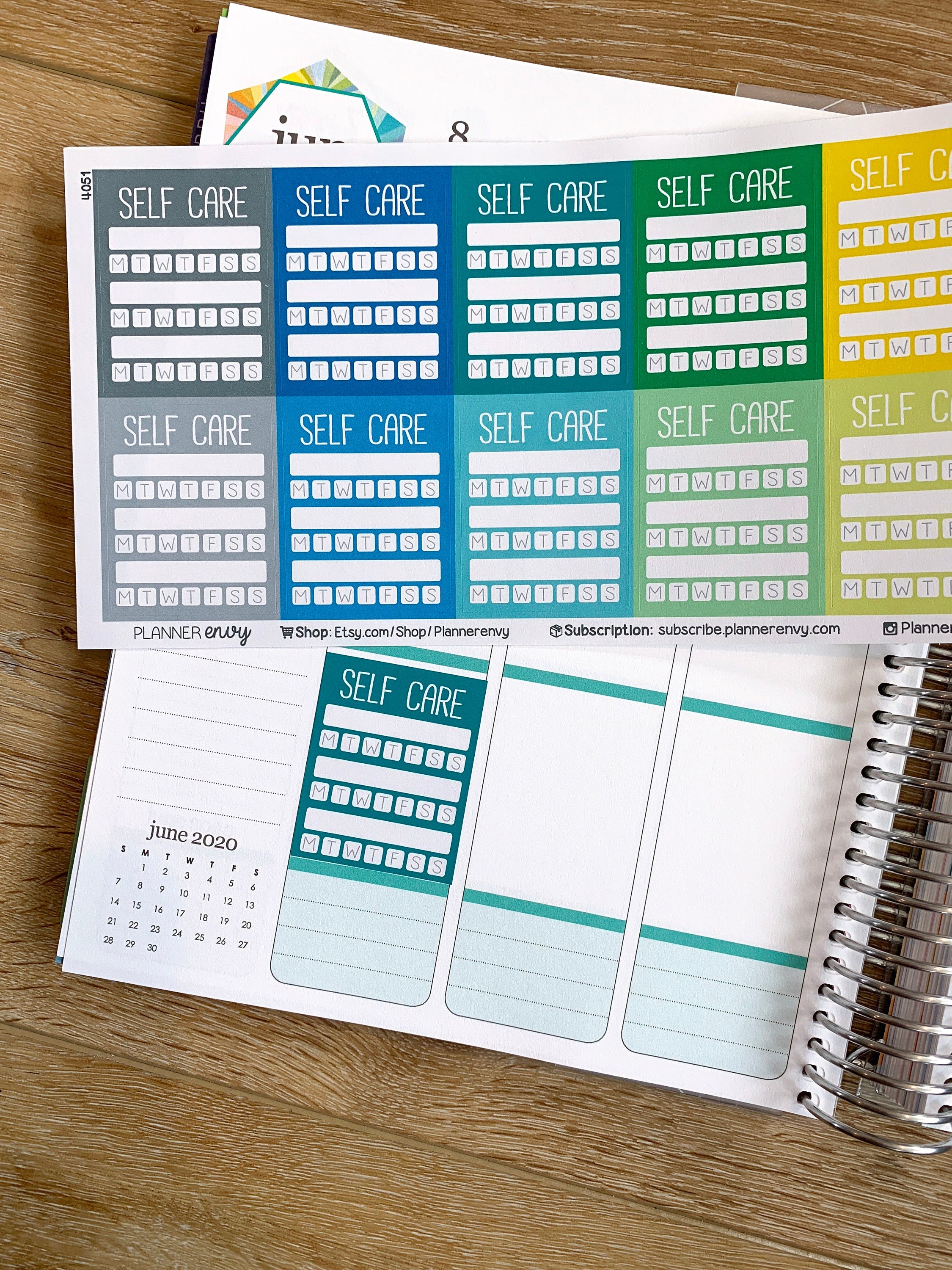 Self Care Habit Tracker Weekly Sidebar Planner Stickers to be used with Erin Condren ECLP, Happy Planner, Recollections (#4051) ✦ Each sticker is 1.5 inches wide by 1.9 inches in length. ✦ Sticker sheet is 8.5 inches wide by 4.5 inches long. ✦ 10 stickers per sheet. ✦ Professionally printed on matte sticker paper. Once these are positioned, they cannot always be moved. They do seem to pull up pretty easily and can be re-stuck to the pages of the ECLP & Happy Planner, but do not pull up cleanly from Recollections or from on top of other stickers. ✦ Bright, vibrant, and ready to make your planner stand out! ✦ These do not have any finish and should be easy to write on with most pens - ballpoint pens and fine tip sharpies seem to look the best! ✦ Save on shipping when you buy multiple sheets! ▶ ▶ ▶ To view more Planner Envy brand stickers, click here to view my shop: https://www.etsy.com/shop/PlannerEnvy ▶ ▶ ▶ DEALS & DISCOUNTS ◀◀◀ ✦ Spend $15 or more, get 10% off >> "SAVE10ON15" ✦ Spend $20 or more, get 15% off >> "SAVE15ON20" ✦ Spend $35 or more, get 20% off >> "SAVE20ON35" **ONE COUPON CODE PER TRANSACTION** ▶ ▶ ▶ CURRENT SHIPPING TIME ◀◀◀ Planner stickers will usually be shipped within 3-5 business days depending on current orders! Please check my shop homepage and announcement to see my current shipping time and make sure I am not on vacation or out of town. ▶ ▶ ▶ USAGE & COPYRIGHT ◀◀◀ ALL ITEMS ARE FOR PERSONAL USE ONLY. © Planner Envy PRINTED PAGES, STICKERS AND OTHER PHYSICAL ITEMS All of my physical items are for person use only. No commercial use. They can be used for your personal planner or be gifted for personal use. They are not to be sold as is or manipulated, alone or as part of a group or package, on or off of Etsy.com. Not intended for resale of any kind. © Planner Envy