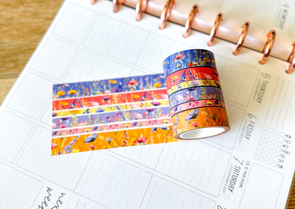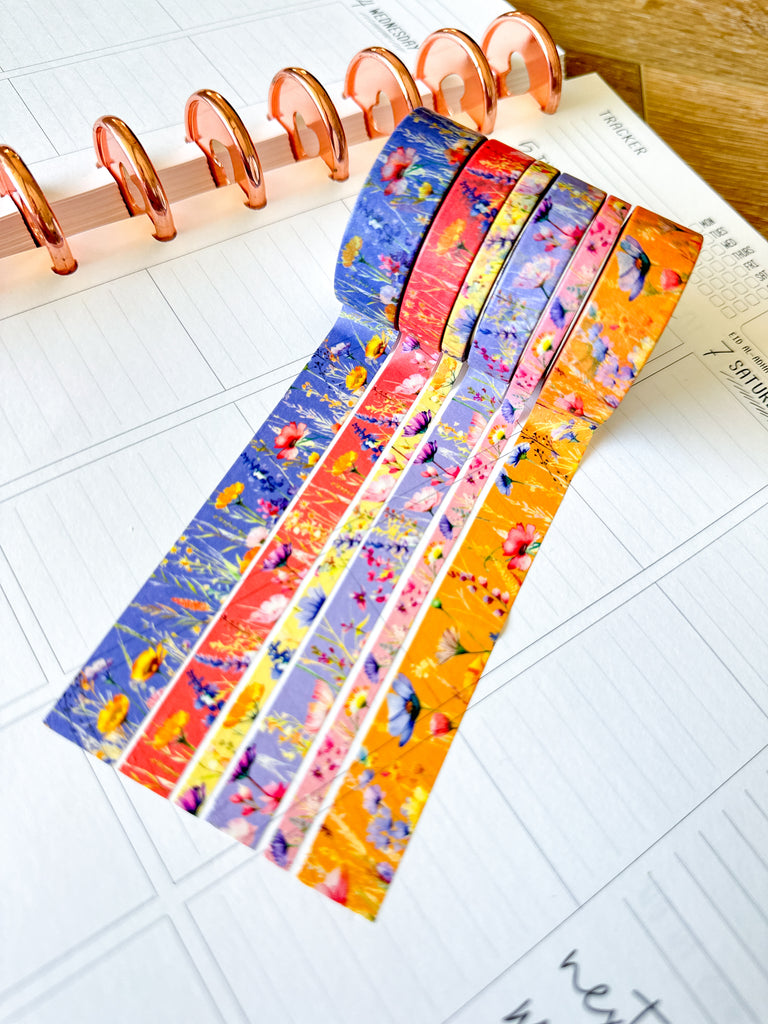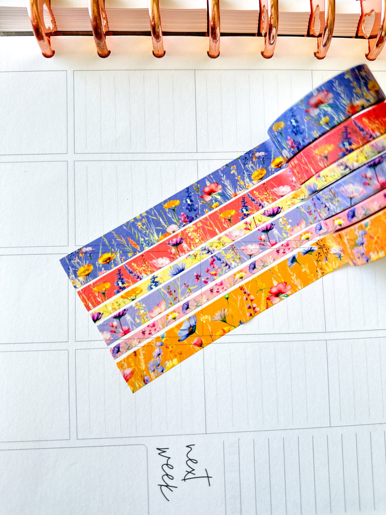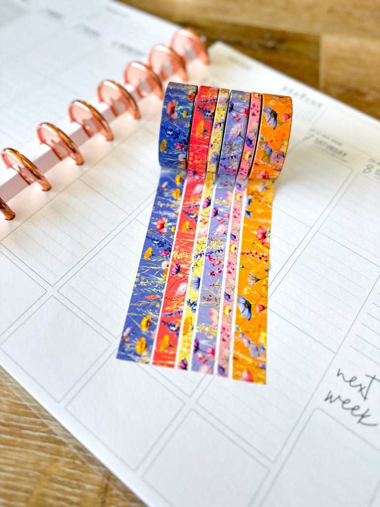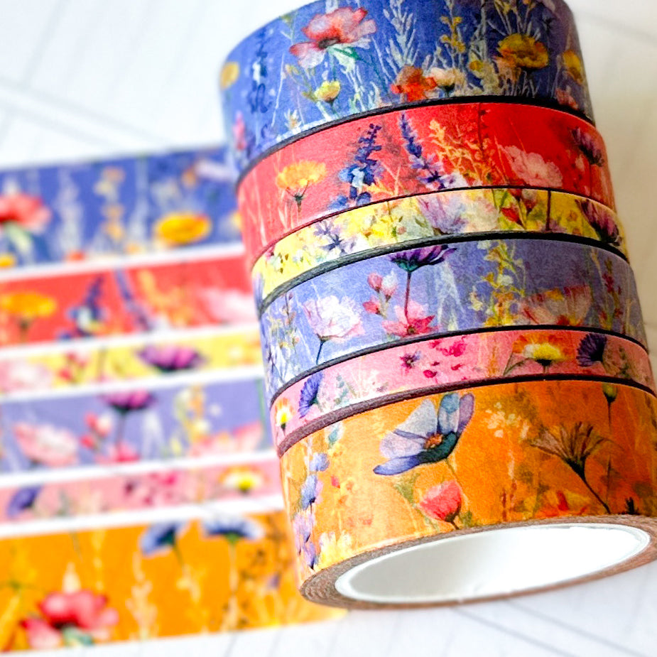 Summer Wildflowers Purple Coral Pink Yellow Periwinkle Washi Tape Set June 2025 - W134