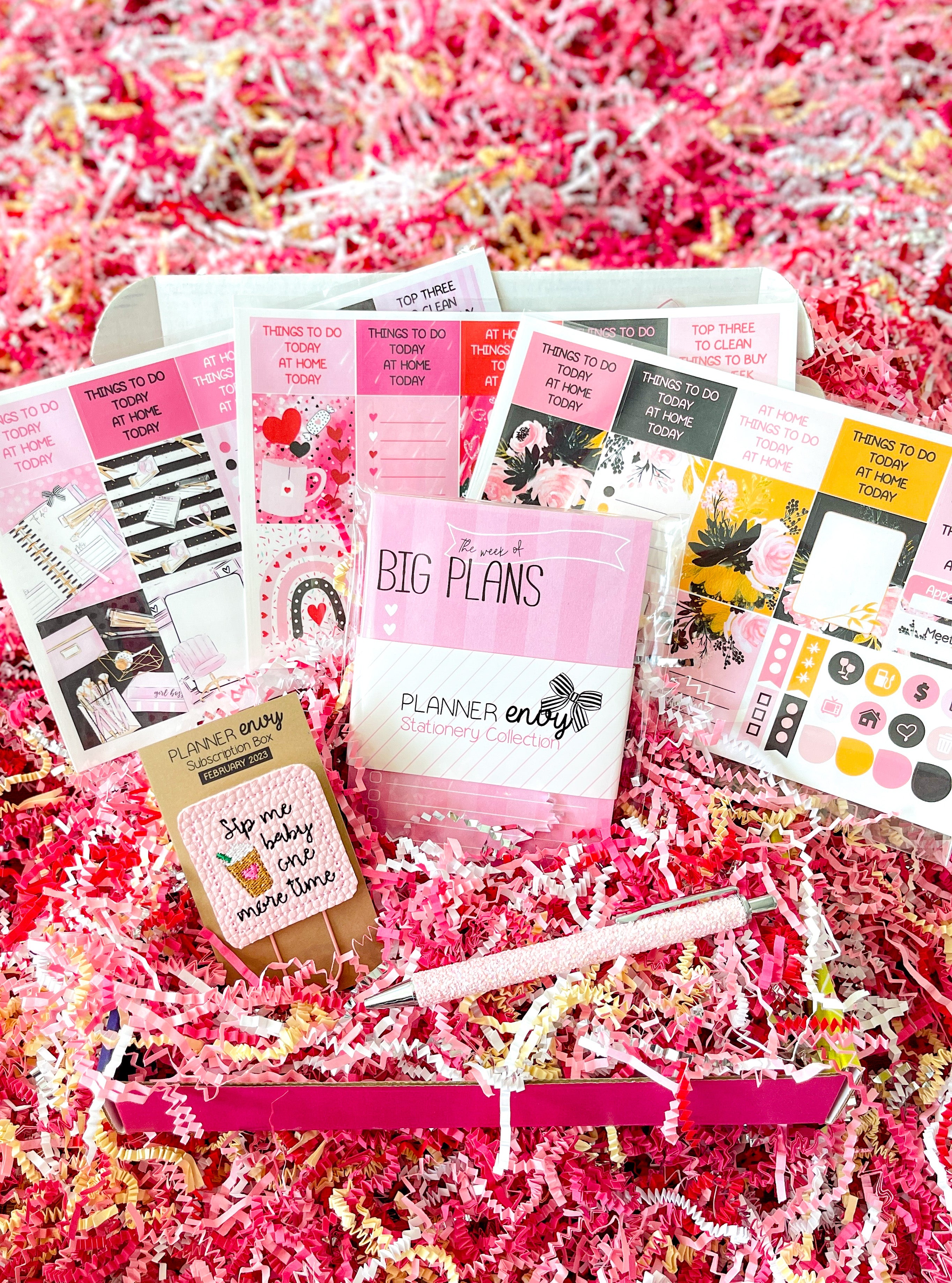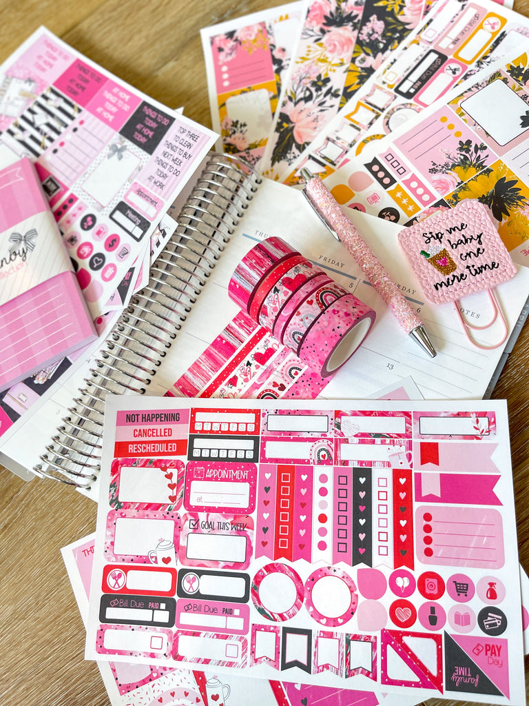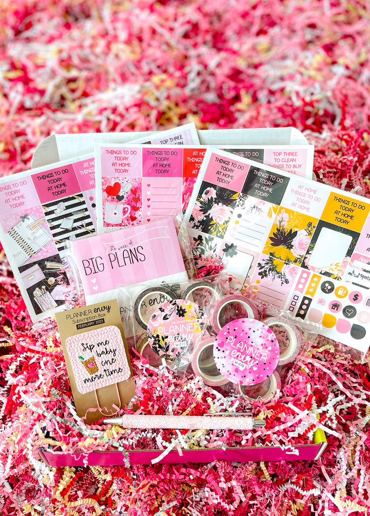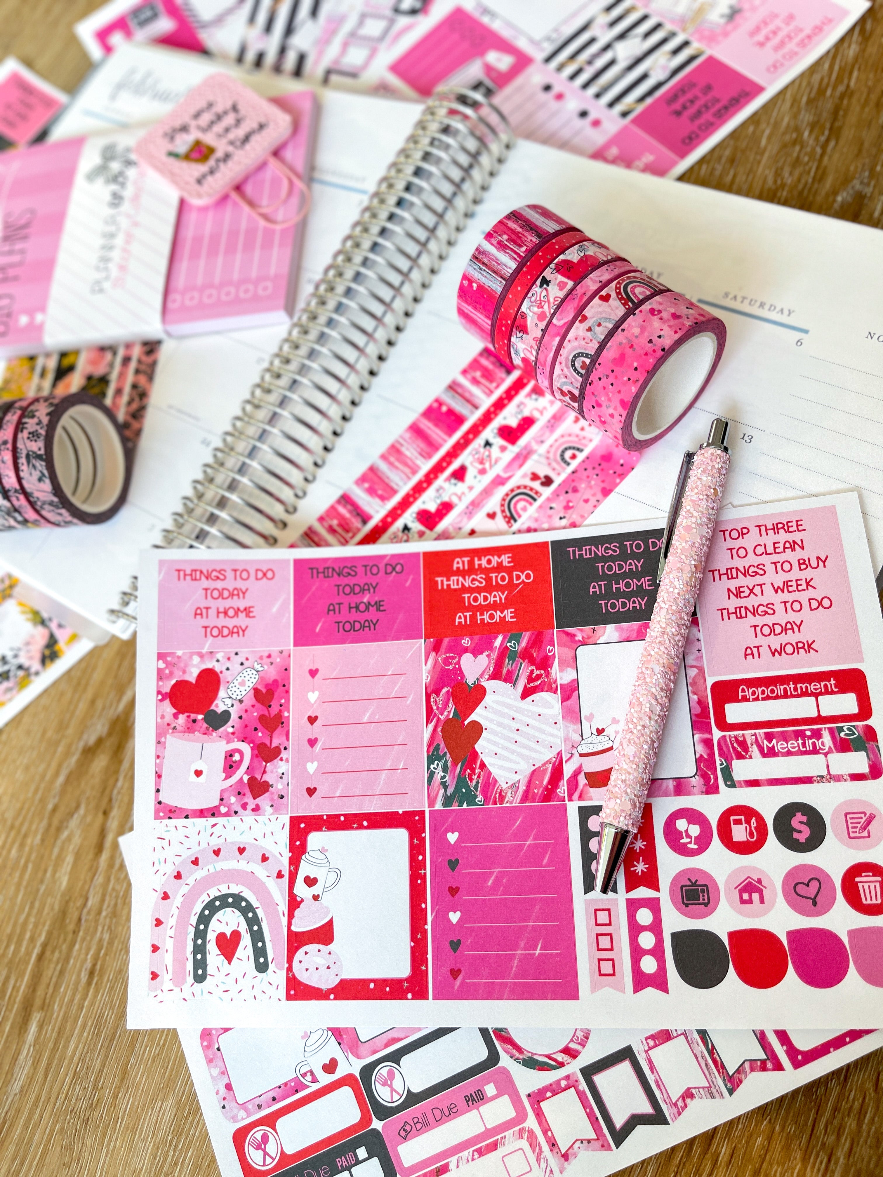 Valentine's Hearts Boho Pink and Red Black Stripes Spring Floral Washi Tape. February 2023 Planner Envy Subscription Box.